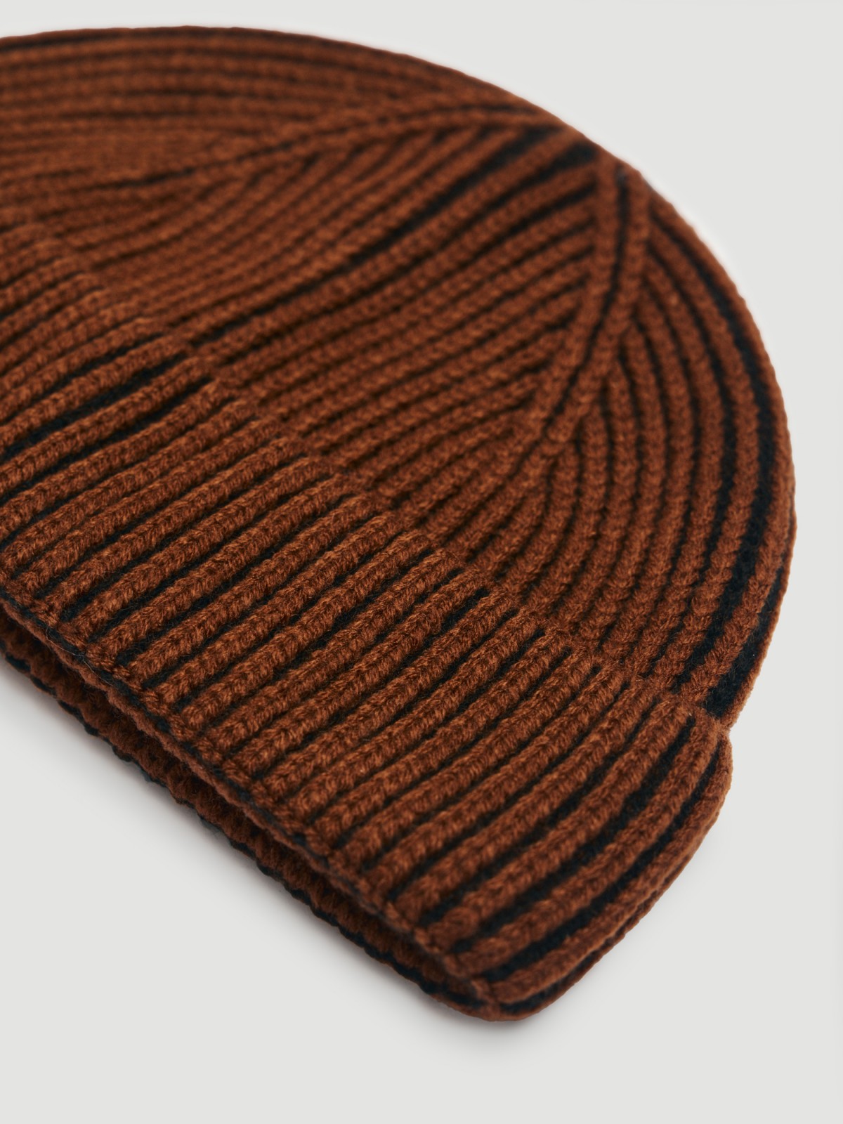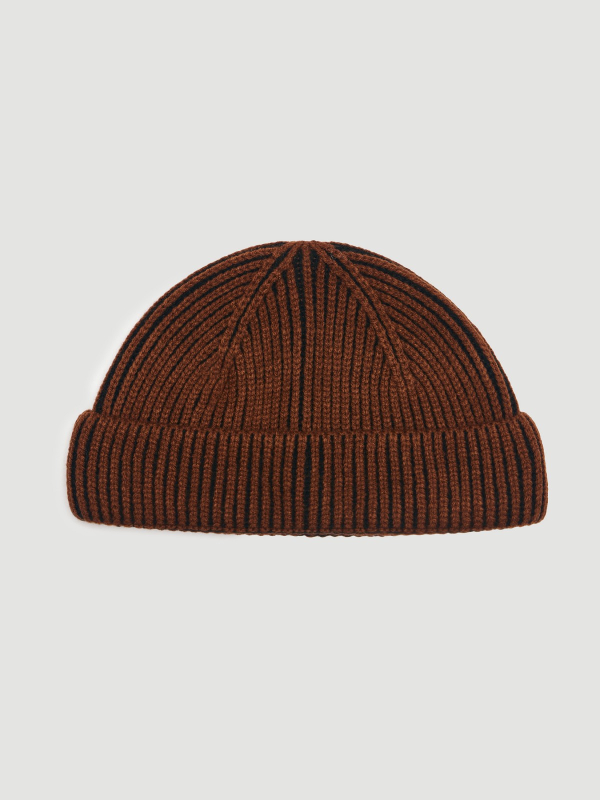 Короткая коричневая вязаная мужская шапка-бини с отворотом из тёплой акриловой пряжи.