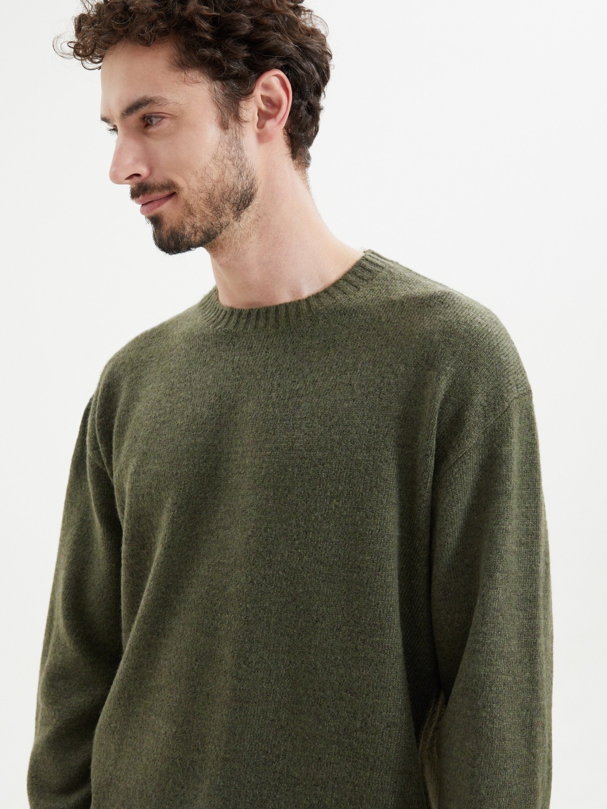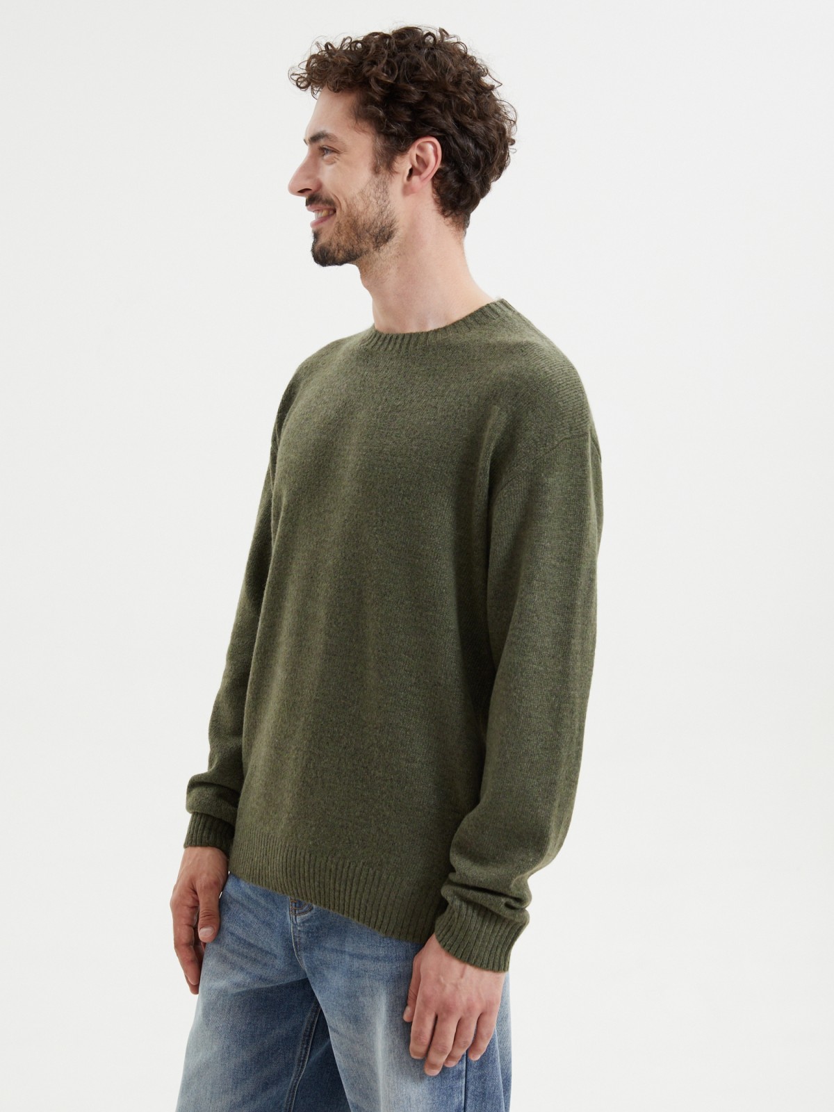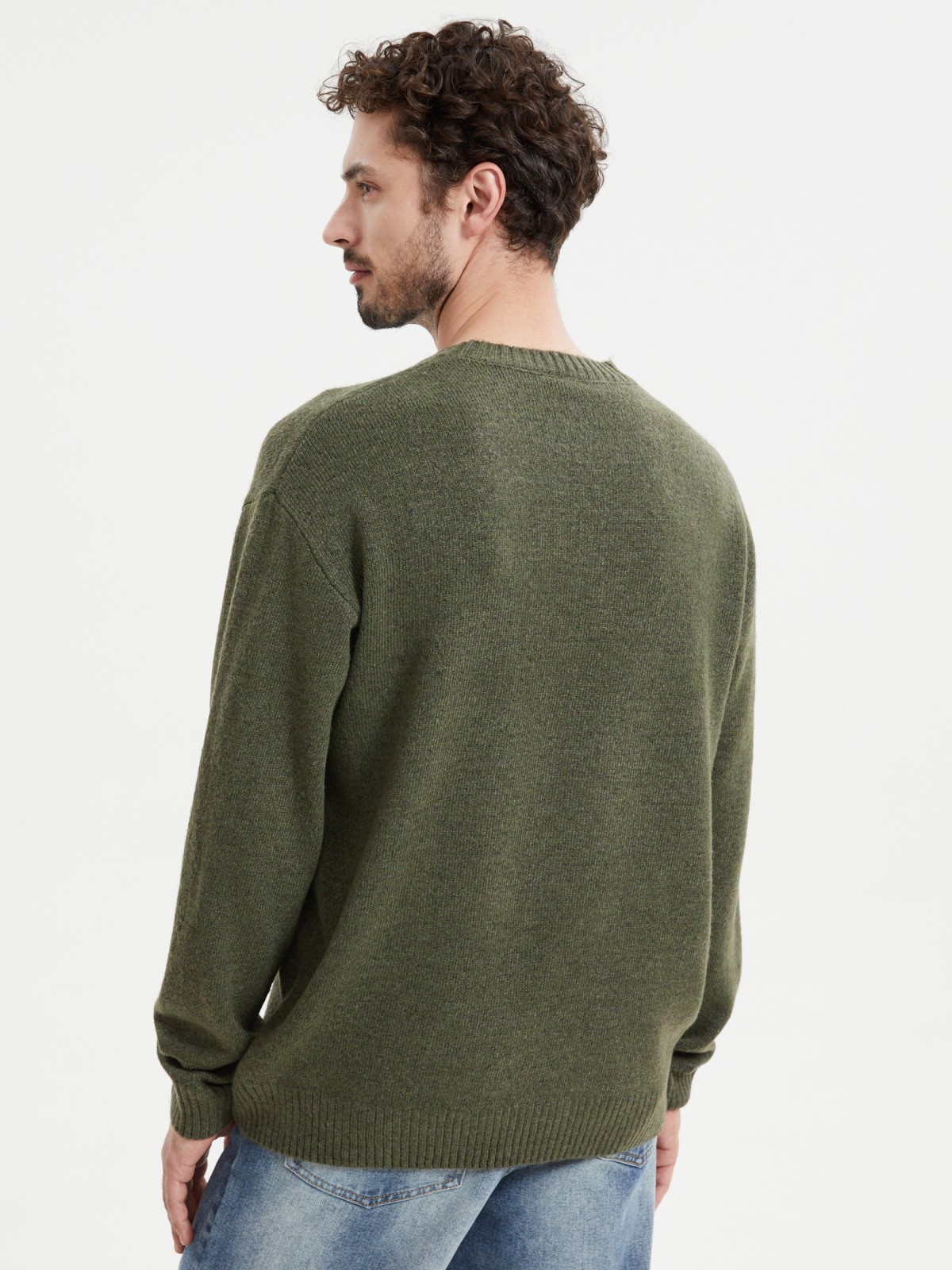 Вязаный мужской джемпер из тёплой пряжи с акрилом в зелёном хаки цвете станет идеальной основой для создания множества сдержанных базовых или модных многослойных образов на каждый день в холодный сезон. Модель представлена в больших размерах.