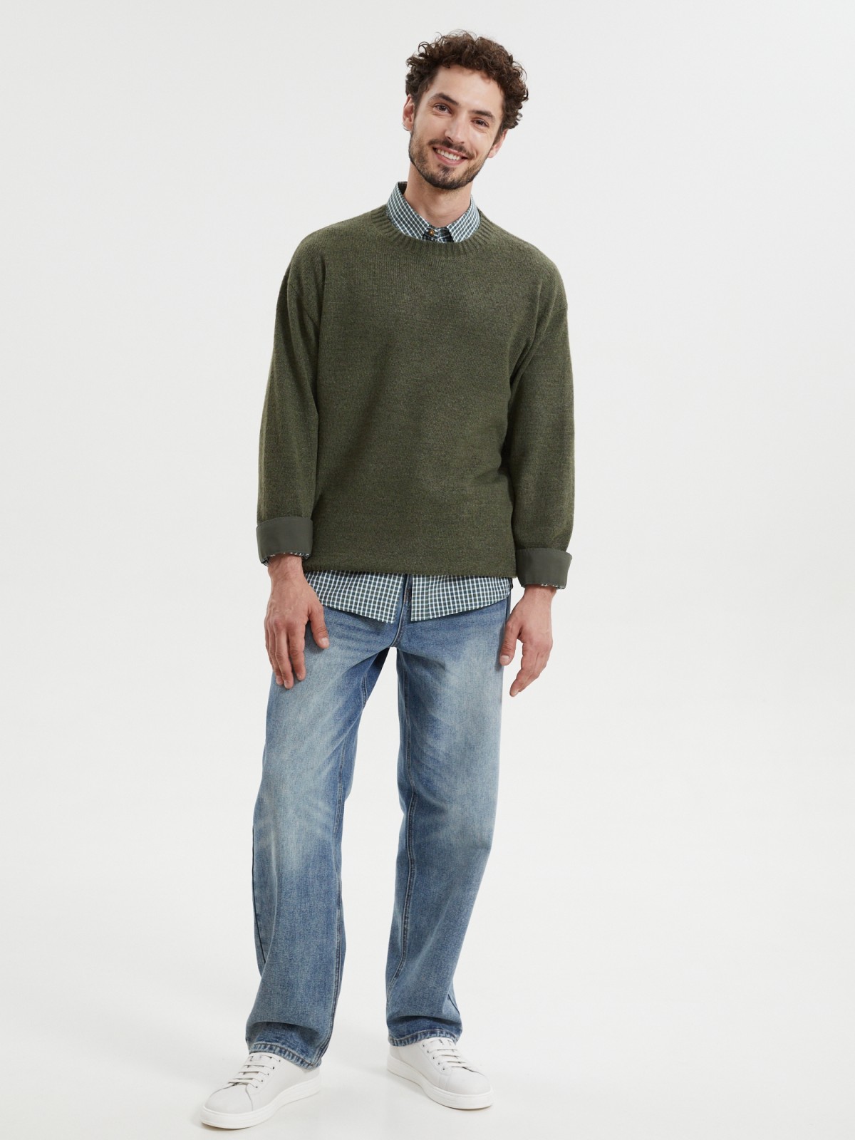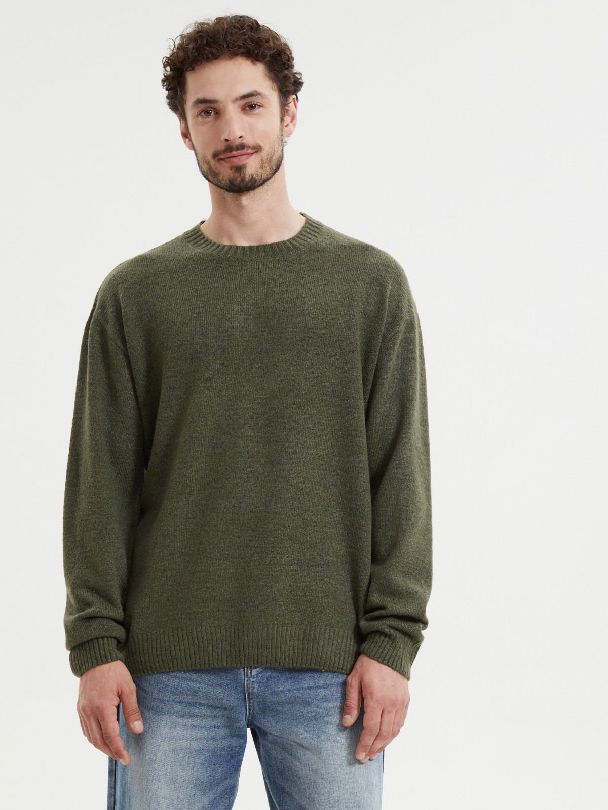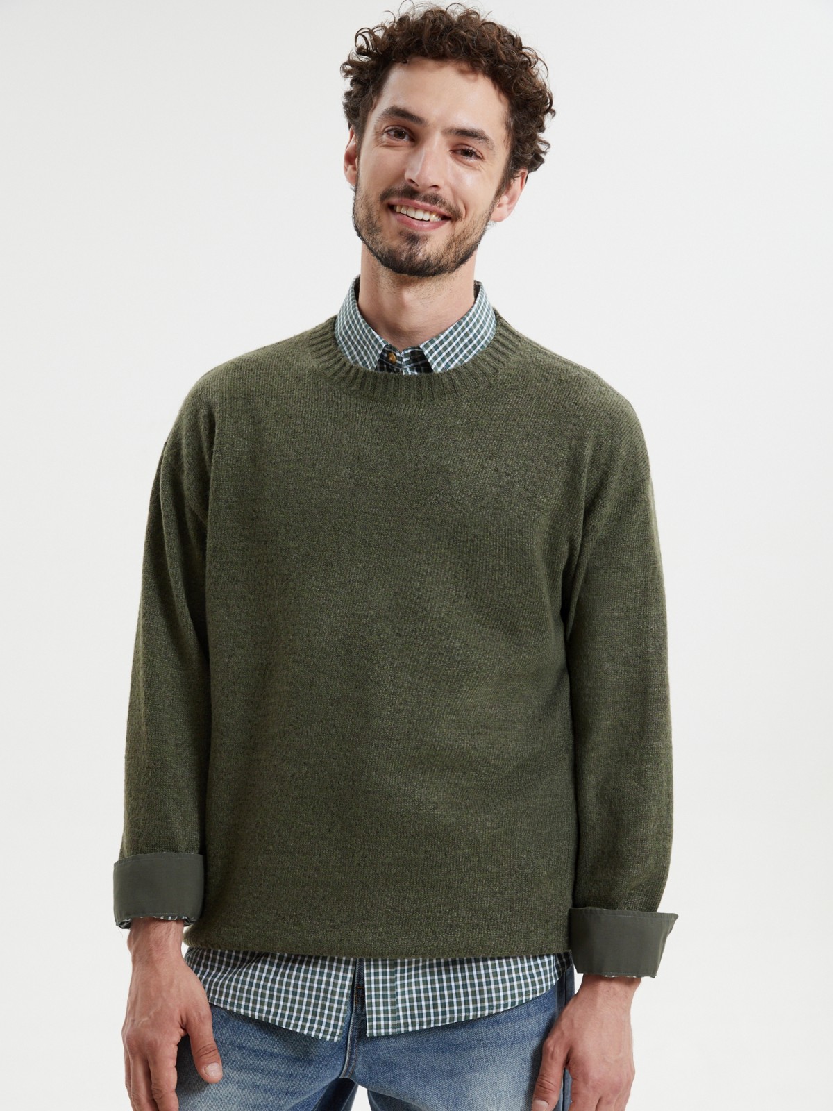 Вязаный мужской джемпер из тёплой пряжи с акрилом в зелёном хаки цвете станет идеальной основой для создания множества сдержанных базовых или модных многослойных образов на каждый день в холодный сезон. Модель представлена в больших размерах.