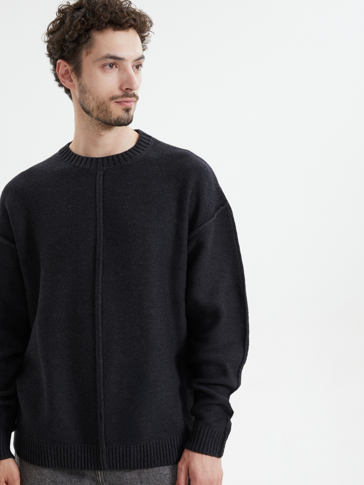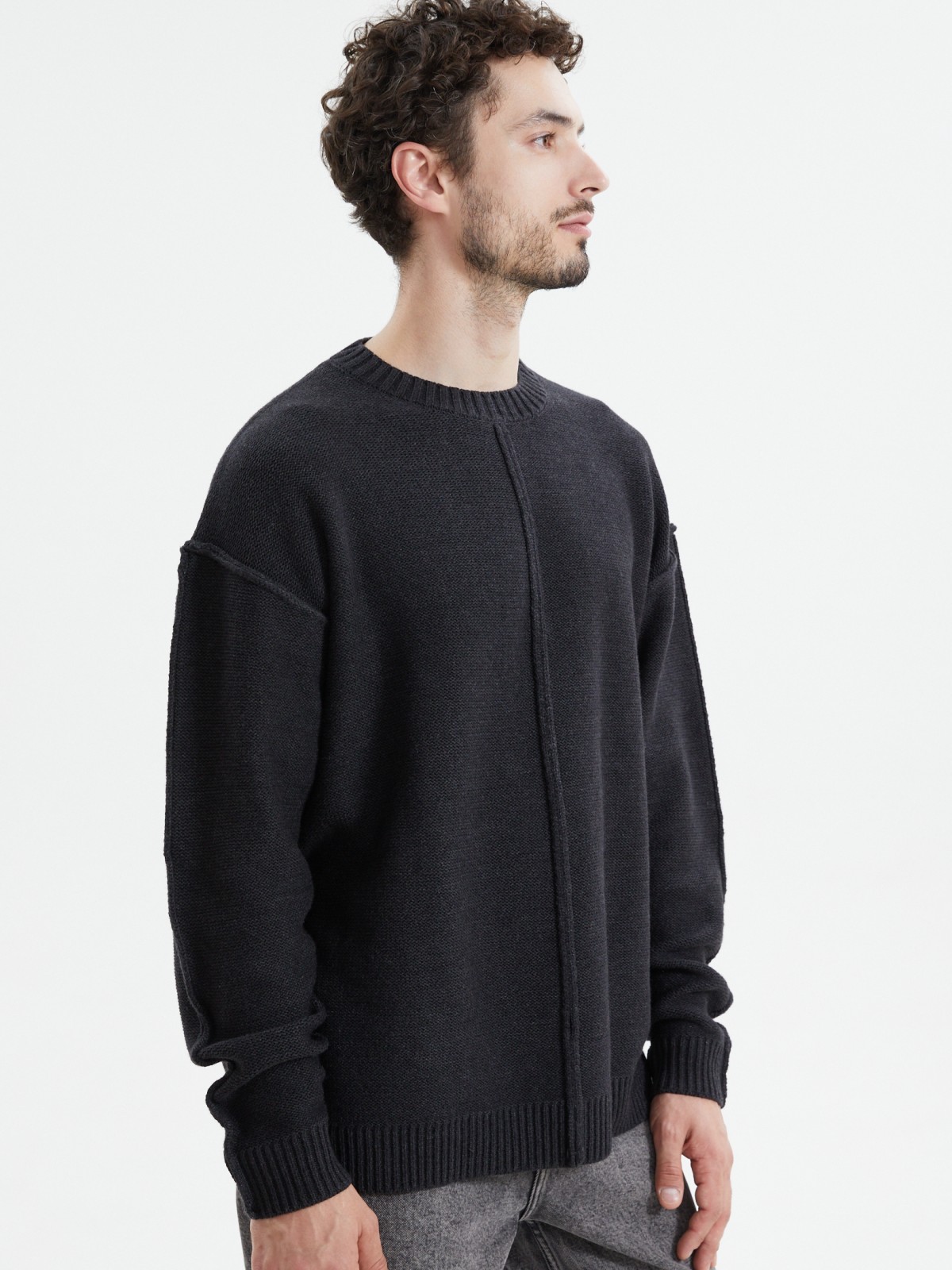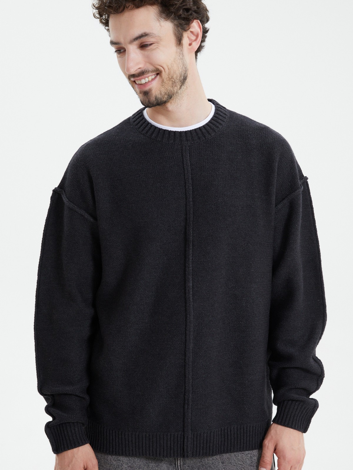 Вязаный тёмно-серый мужской джемпер из тёплой хлопково-акриловой пряжи, акцентированный декоративными "изнаночными" швами, станет идеальной основой для создания множества сдержанных базовых или модных многослойных образов на каждый день в холодный сезон. Модель представлена в больших размерах.