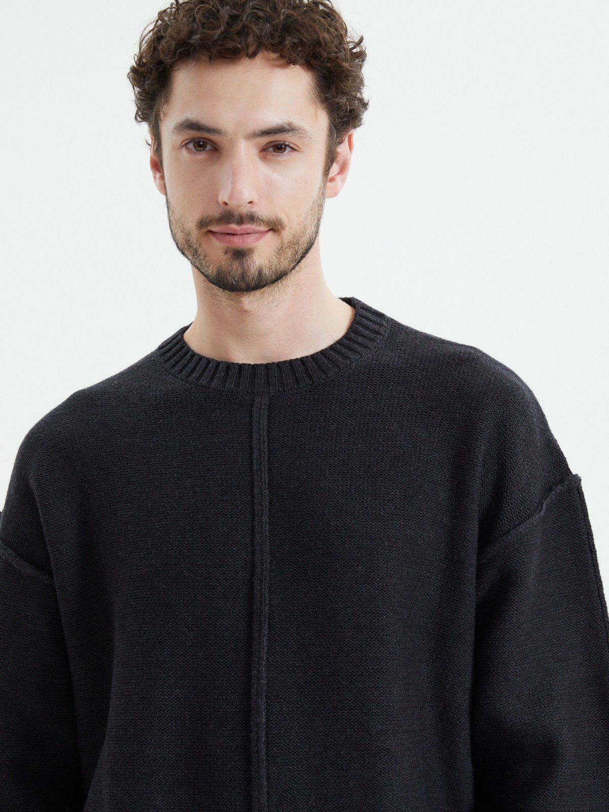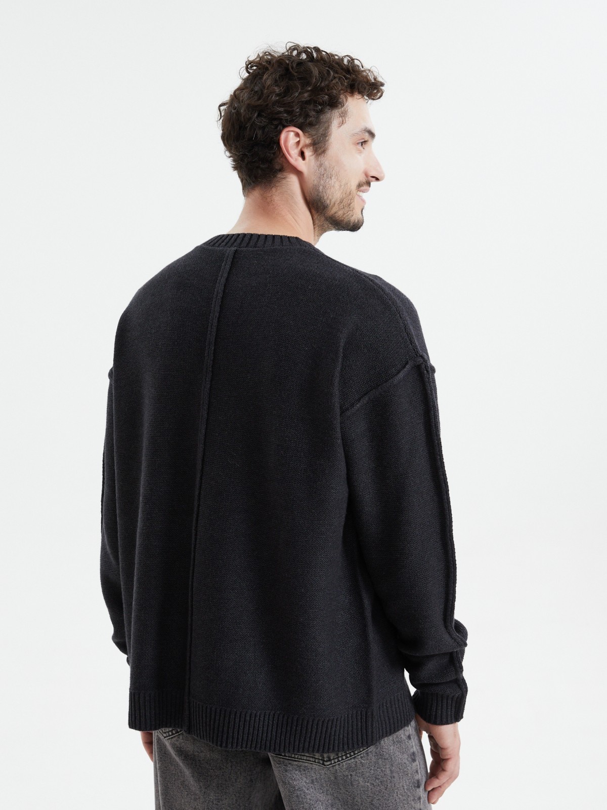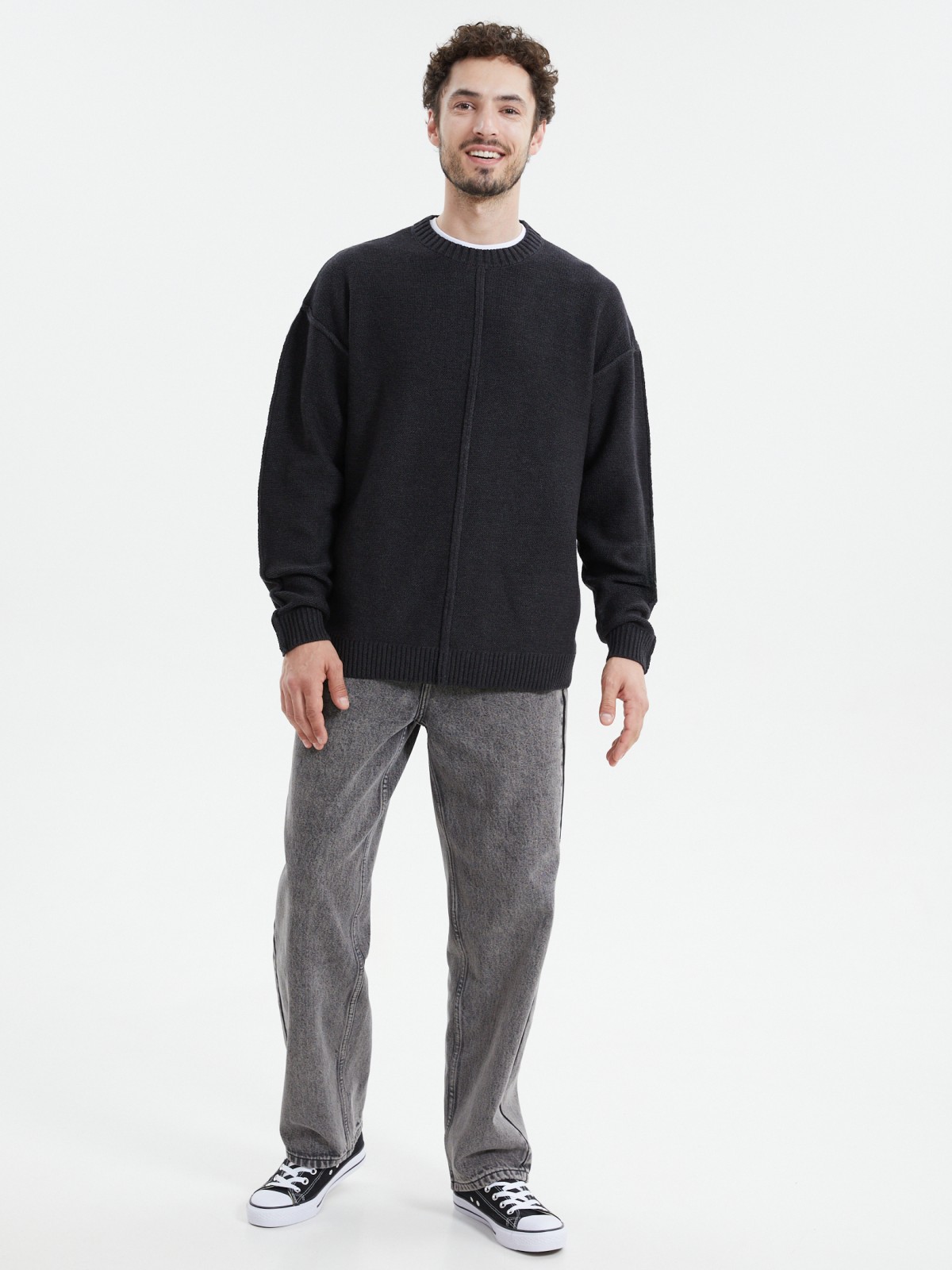 Вязаный тёмно-серый мужской джемпер из тёплой хлопково-акриловой пряжи, акцентированный декоративными "изнаночными" швами, станет идеальной основой для создания множества сдержанных базовых или модных многослойных образов на каждый день в холодный сезон. Модель представлена в больших размерах.