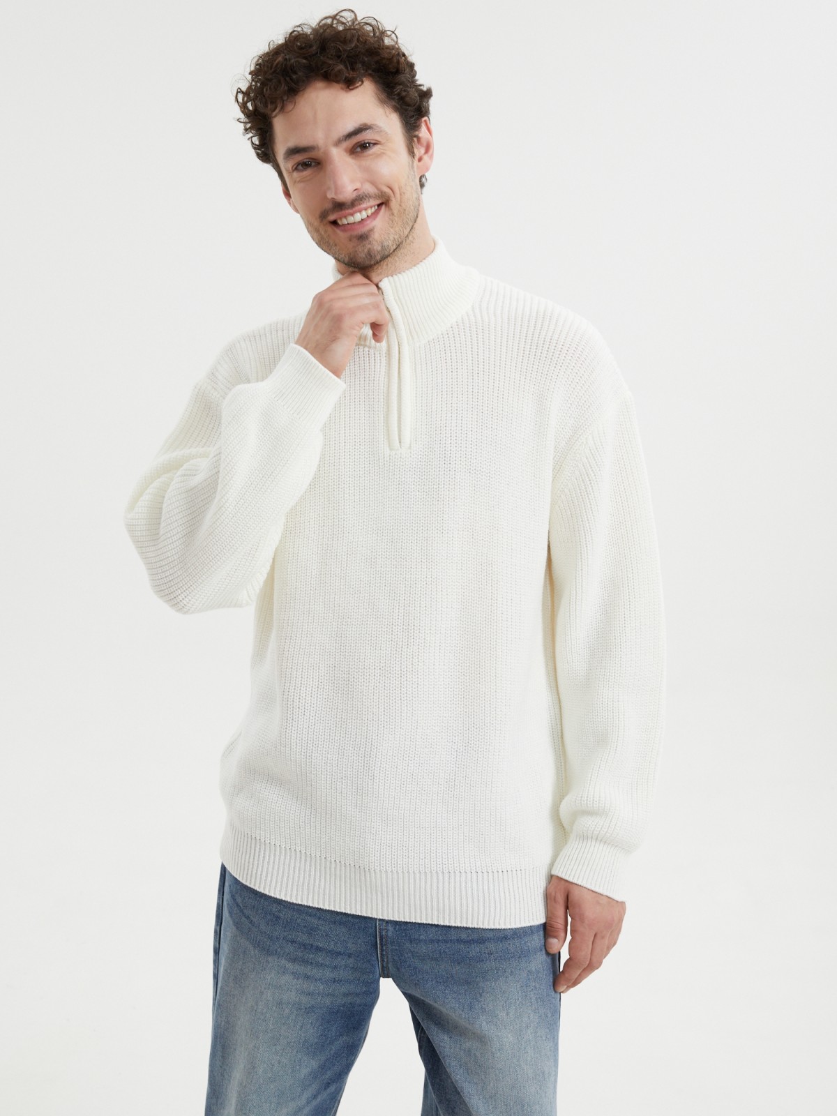 Коричневый мужской вязаный свитер с горлом на молнии станет идеальной основой для создания множества сдержанных базовых или модных многослойных образов на каждый день. Модель представлена в больших размерах.