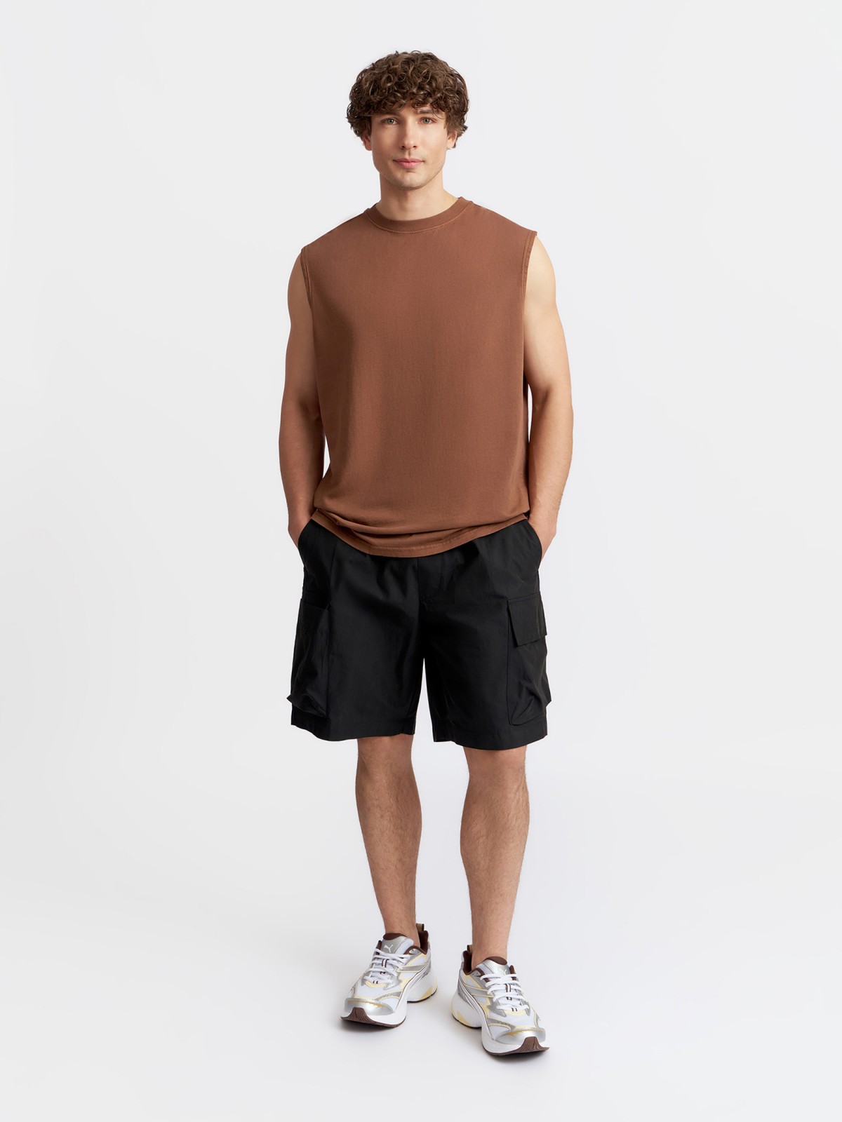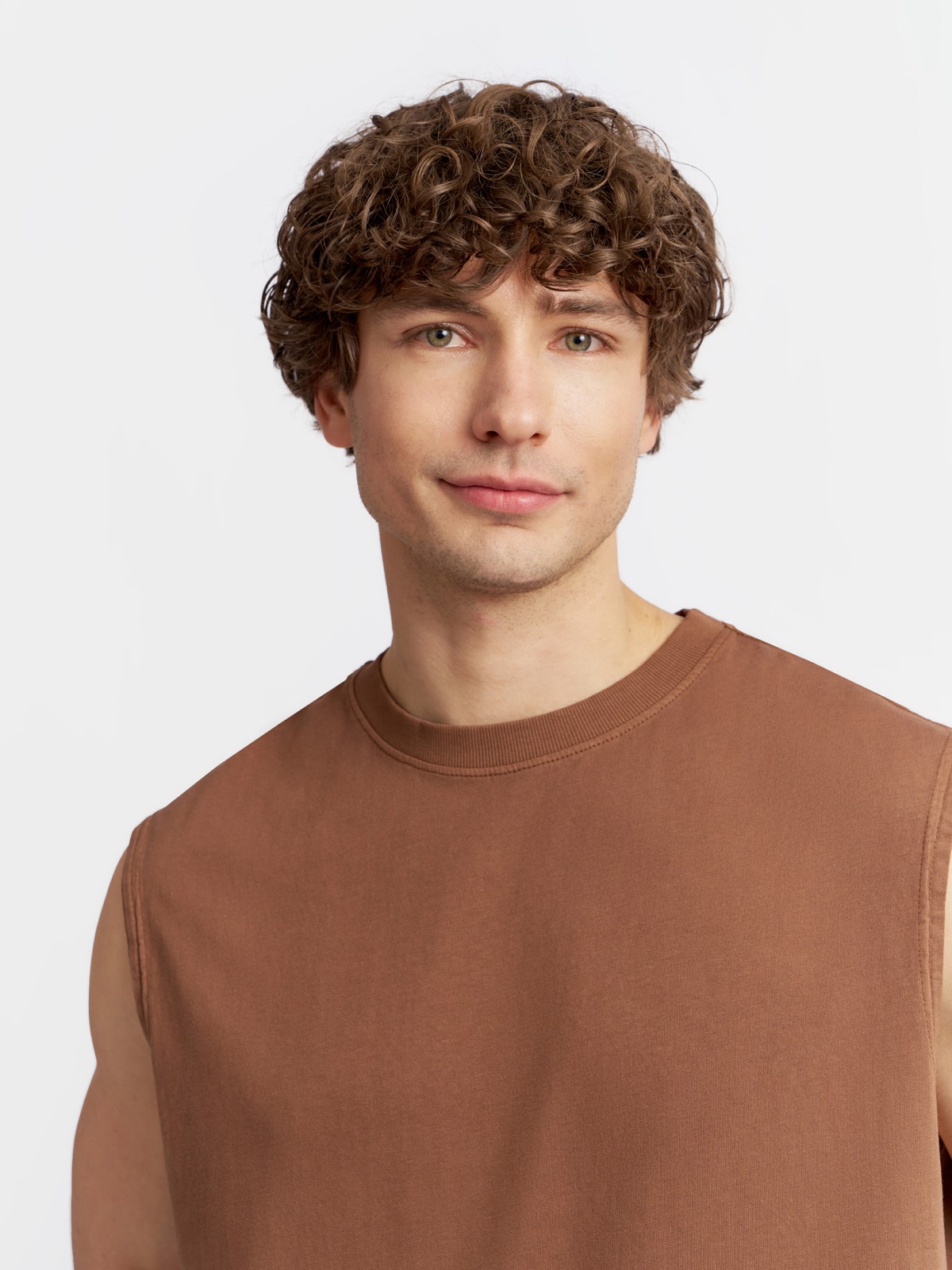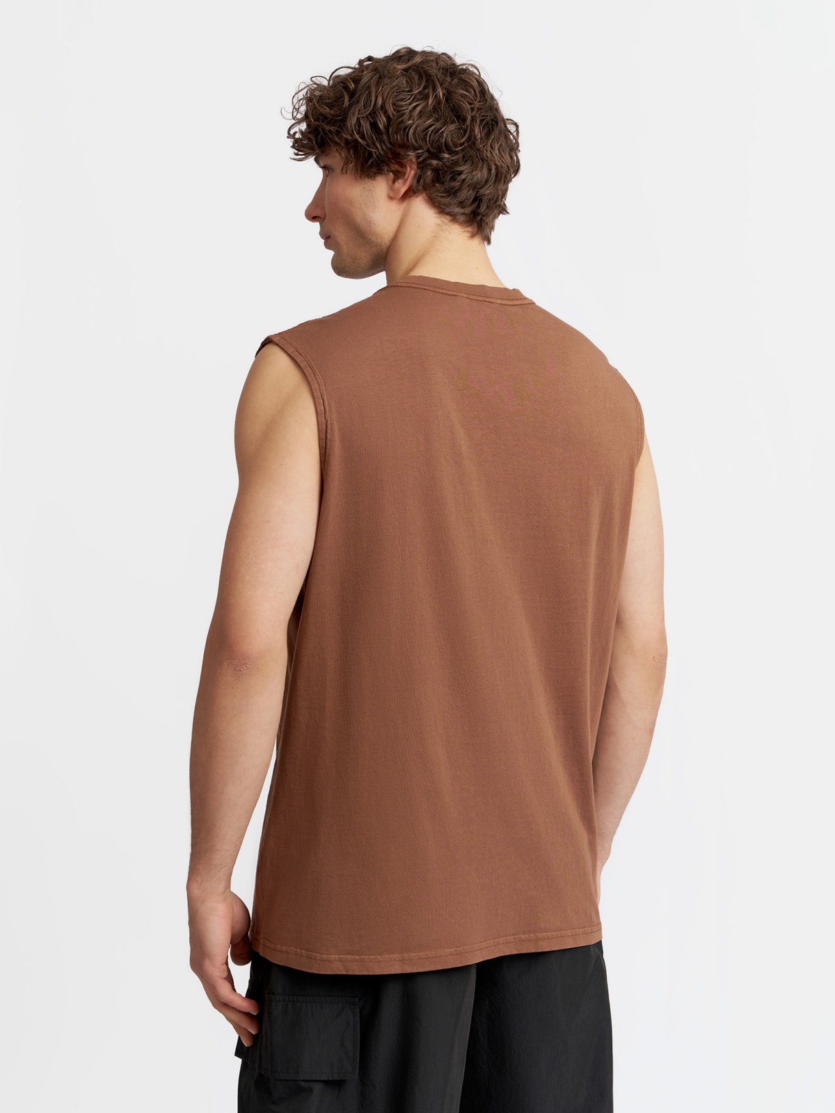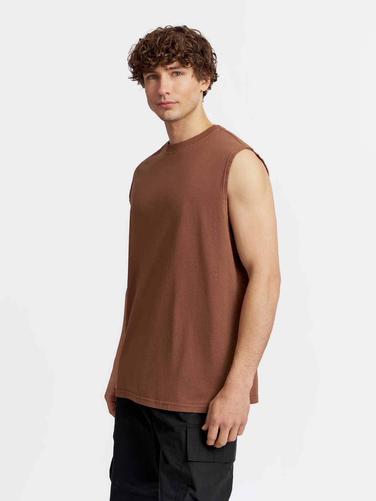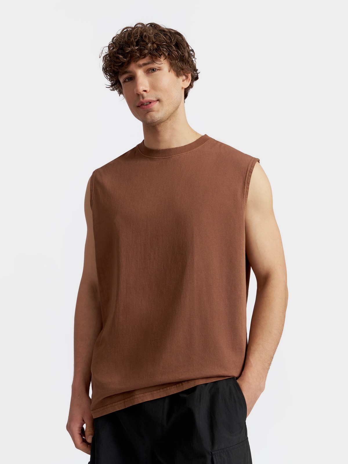 Однотонная коричневая мужская футболка без рукавов из хлопка прекрасно подойдёт к комфортным расслабленным повседневным и спортивным аутфитам на лето, и обеспечит вам непревзойденный комфорт в течение всего дня. Модель представлена в больших размерах.