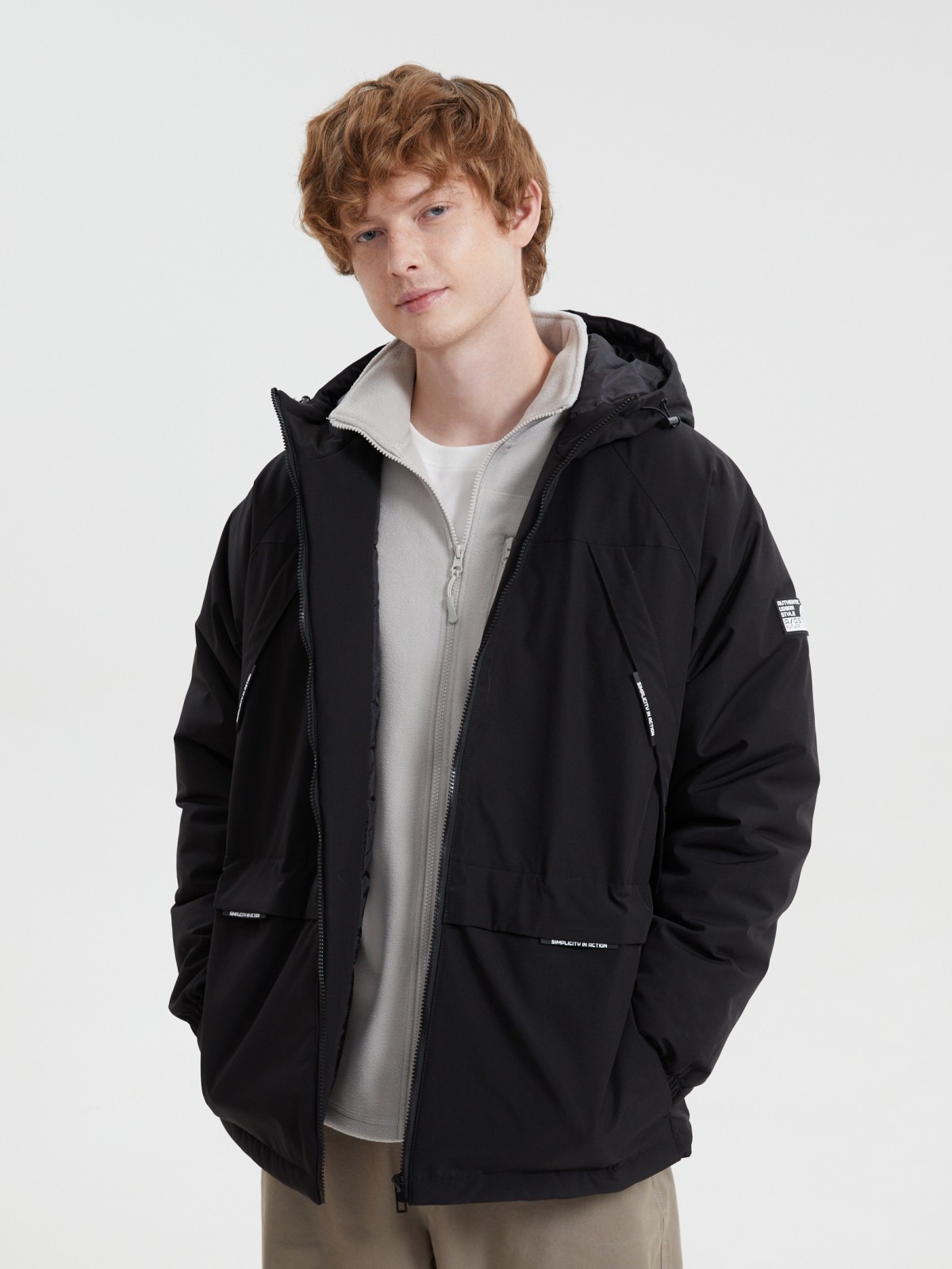 Тёплая чёрная мужская куртка объёмного фасона с капюшоном и слоем синтепона в качестве утеплителя, выполненная в базовом кэжуал-стиле, - идеальный повседневный вариант для тех, кто предпочитает практичность и комфорт на каждый день в холодную погоду непредсказуемого сезона осень-зима. Модель представлена в больших размерах.