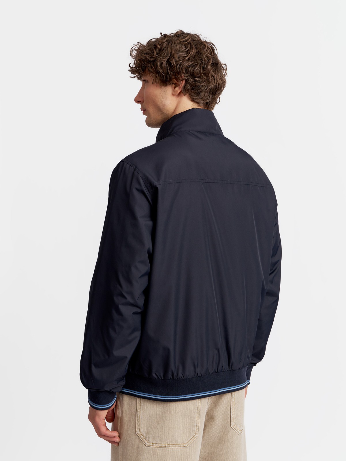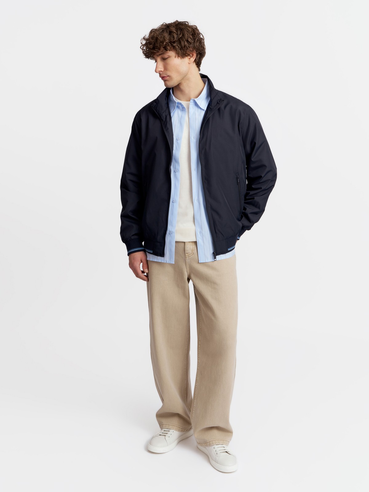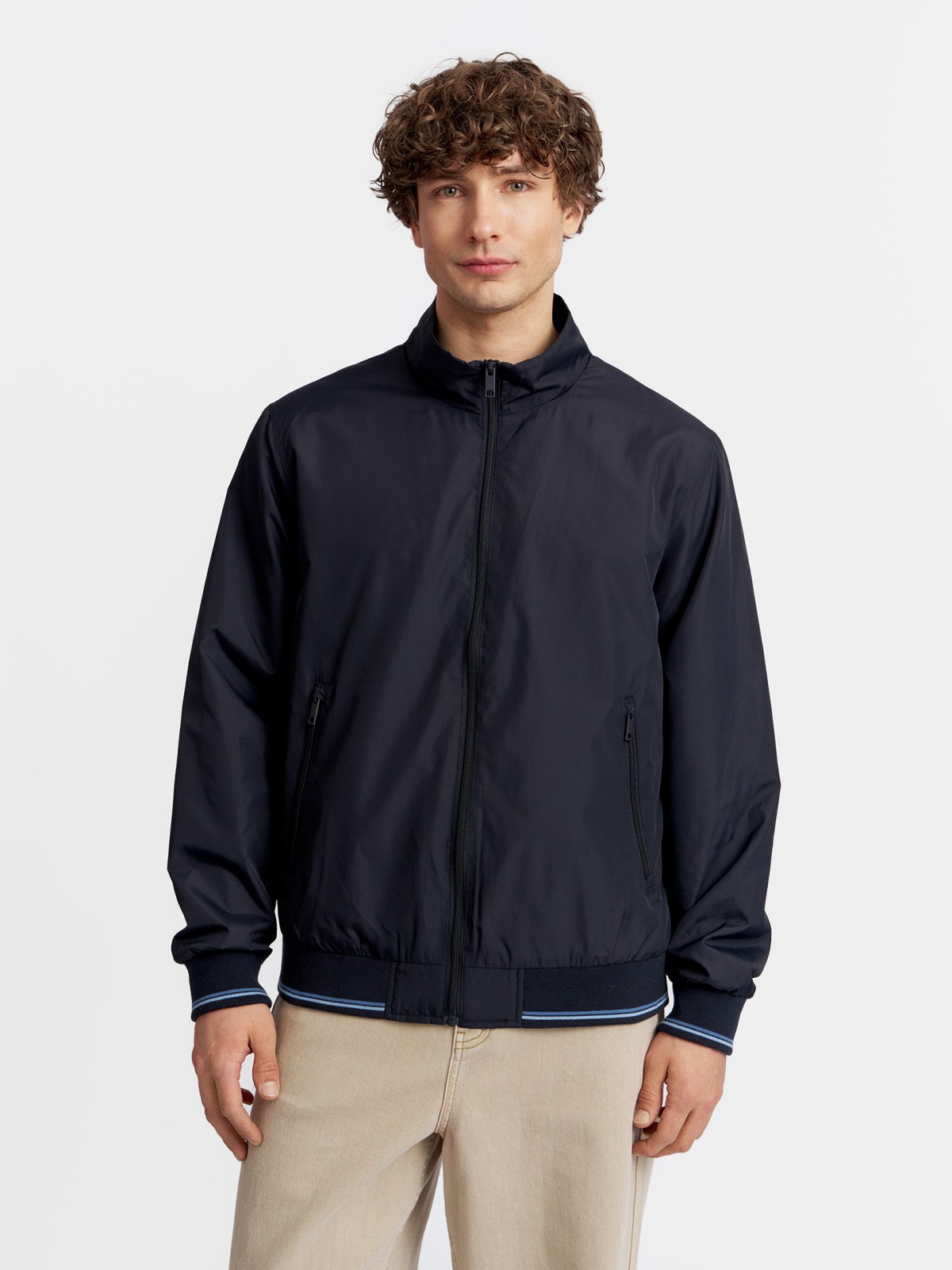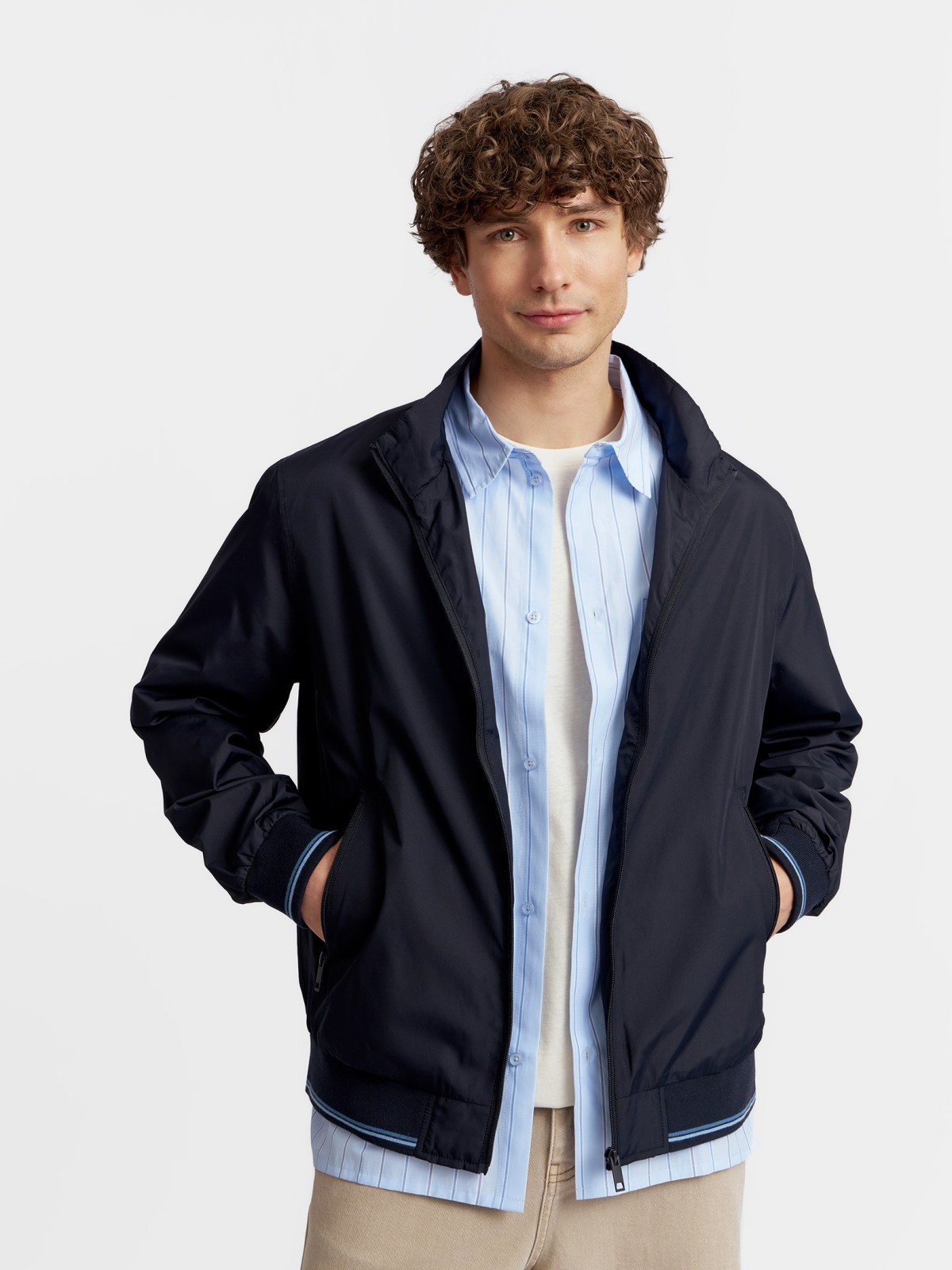 Лёгкая мужская куртка-ветровка фасона "бомбер", выполненная в тёмно-синем цвете без утеплителя, - отличное модное решение для комфортных прогулок на свежем воздухе в тёплое время года. Модель представлена в больших размерах.