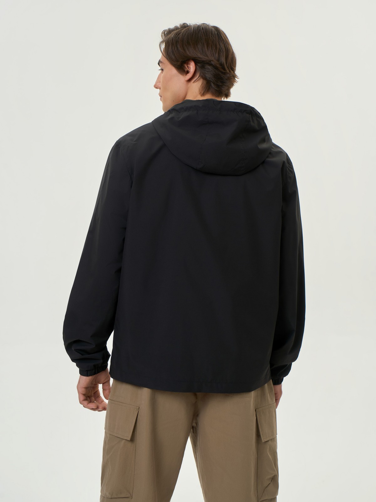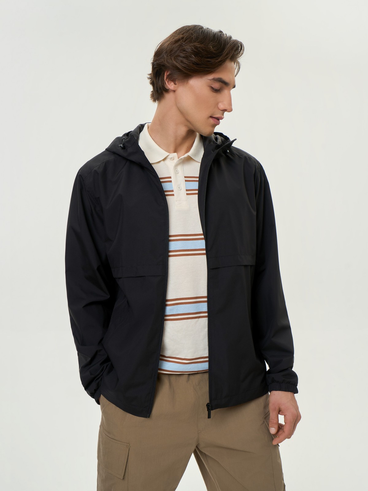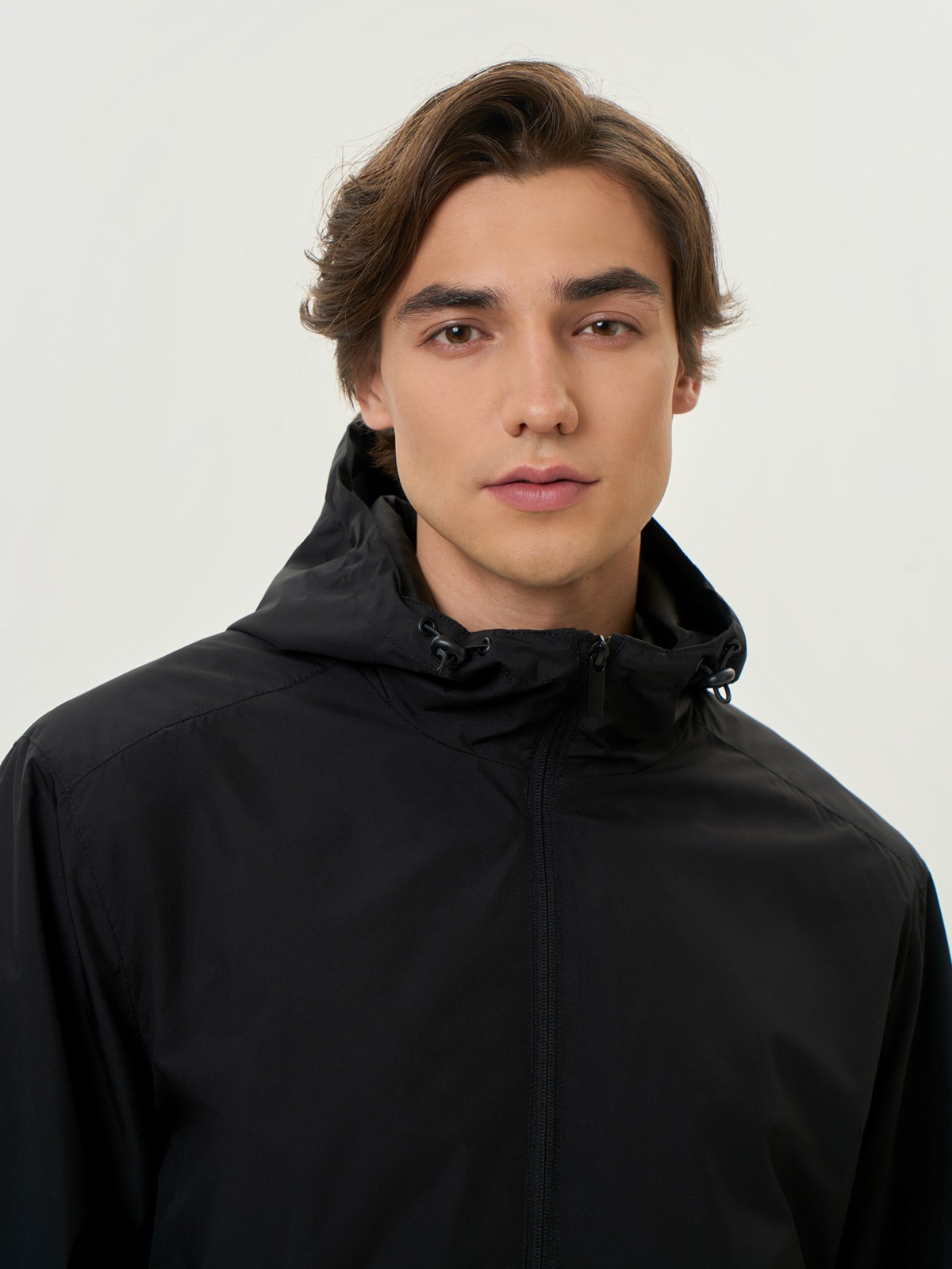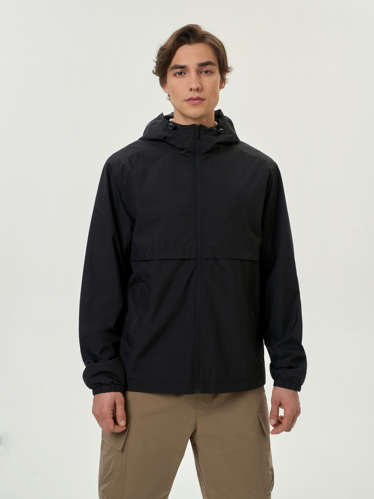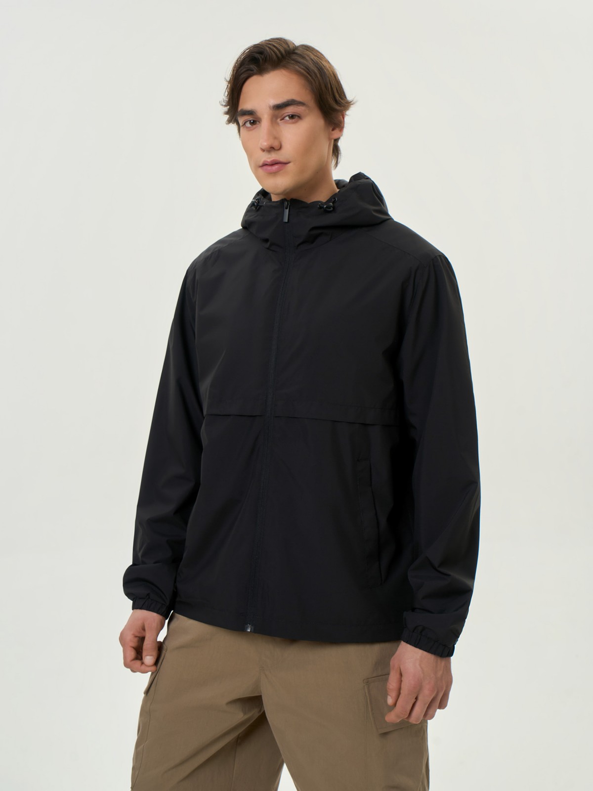 Лёгкая мужская чёрная куртка с капюшоном без утеплителя, выполненная в базовом кэжуал-стиле, - удобный повседневный вариант для тех, кто предпочитает практичность и комфорт на каждый день в тёплое время года. Модель представлена в больших размерах.