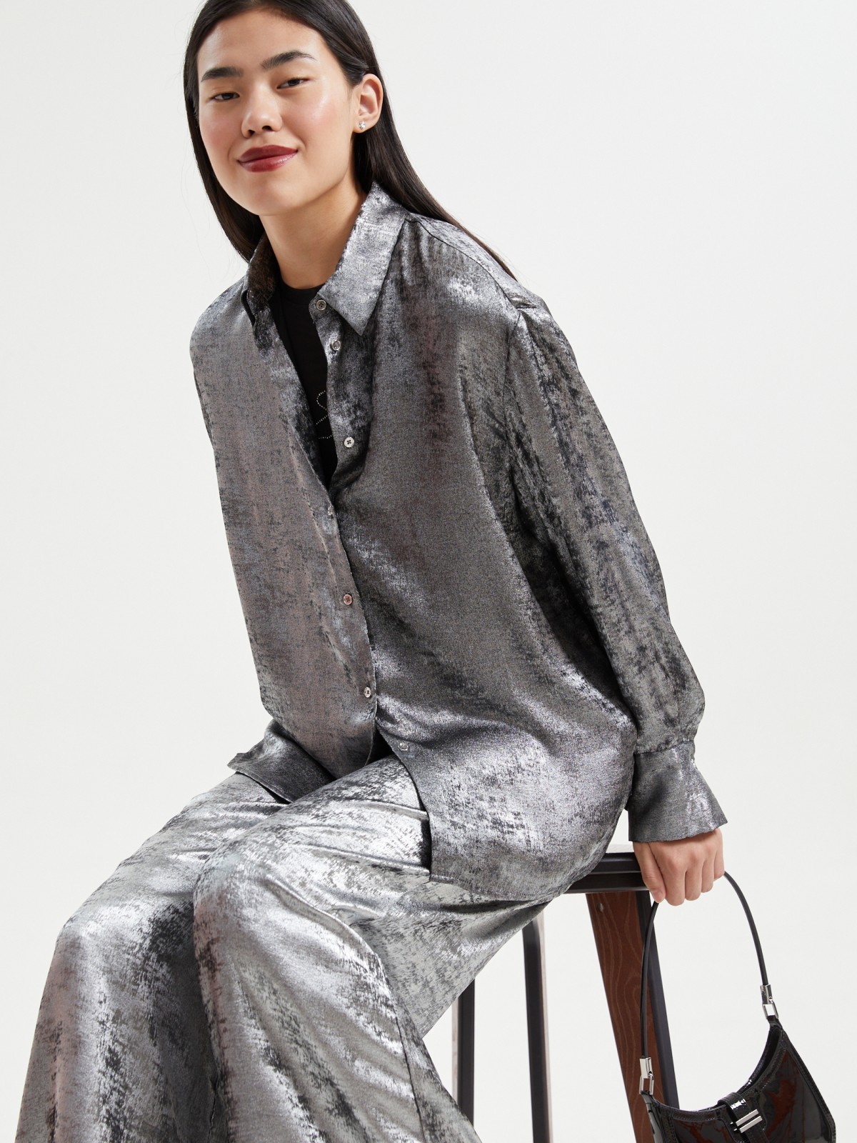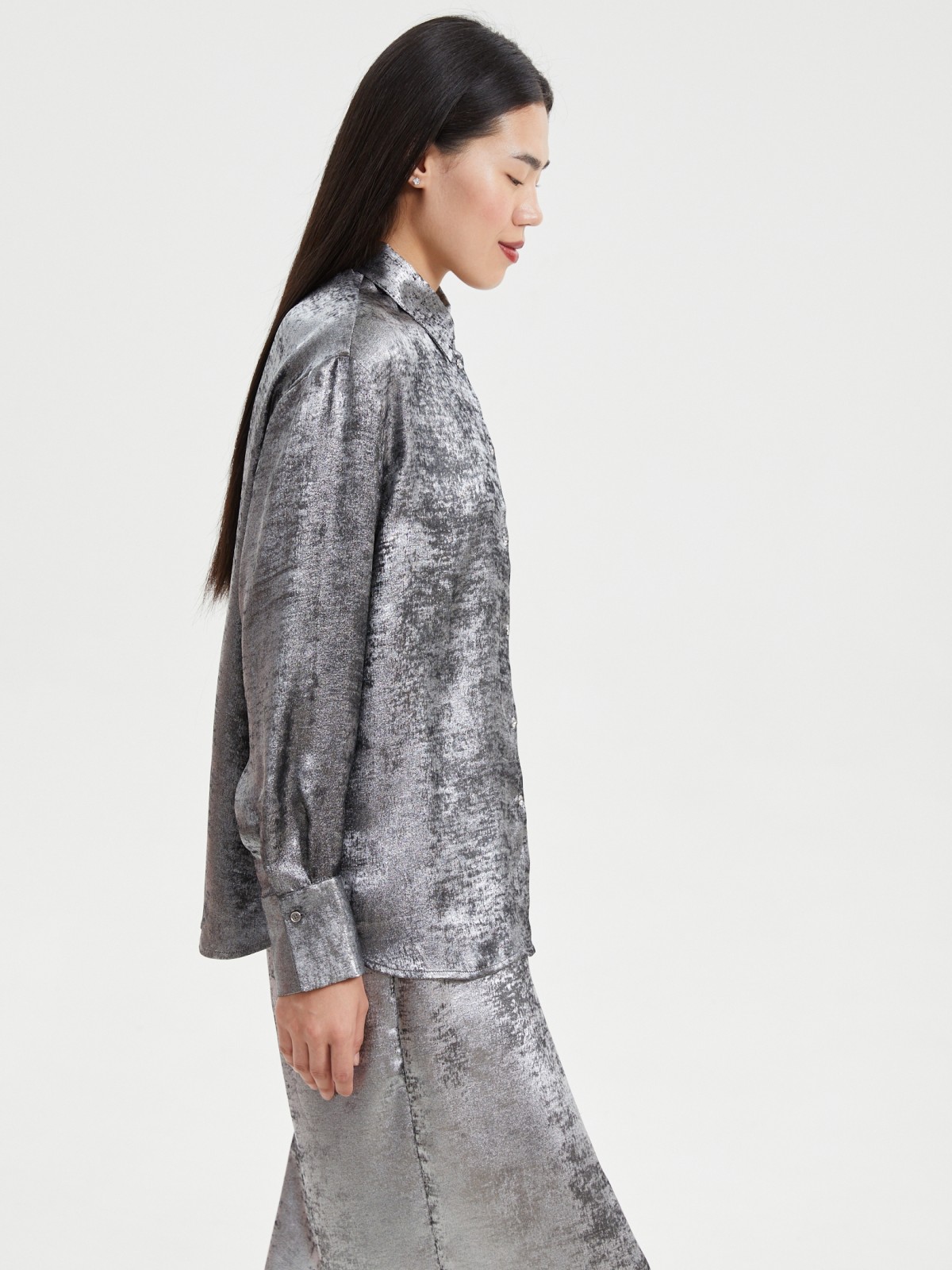 Женская рубашка расслабленного фасона, выполненная из тонкой нарядной ткани с серебряным блеском, прекрасно подойдёт для стильного праздничного образа на новогоднюю вечеринку или корпоратив. Рекомендуем собрать комплект с брюками арт. N2545737Y051 в аналогичном дизайне. Модель представлена в больших размерах.