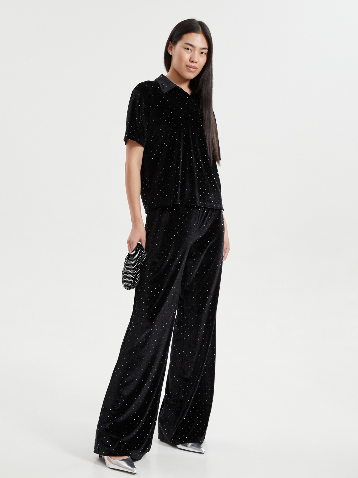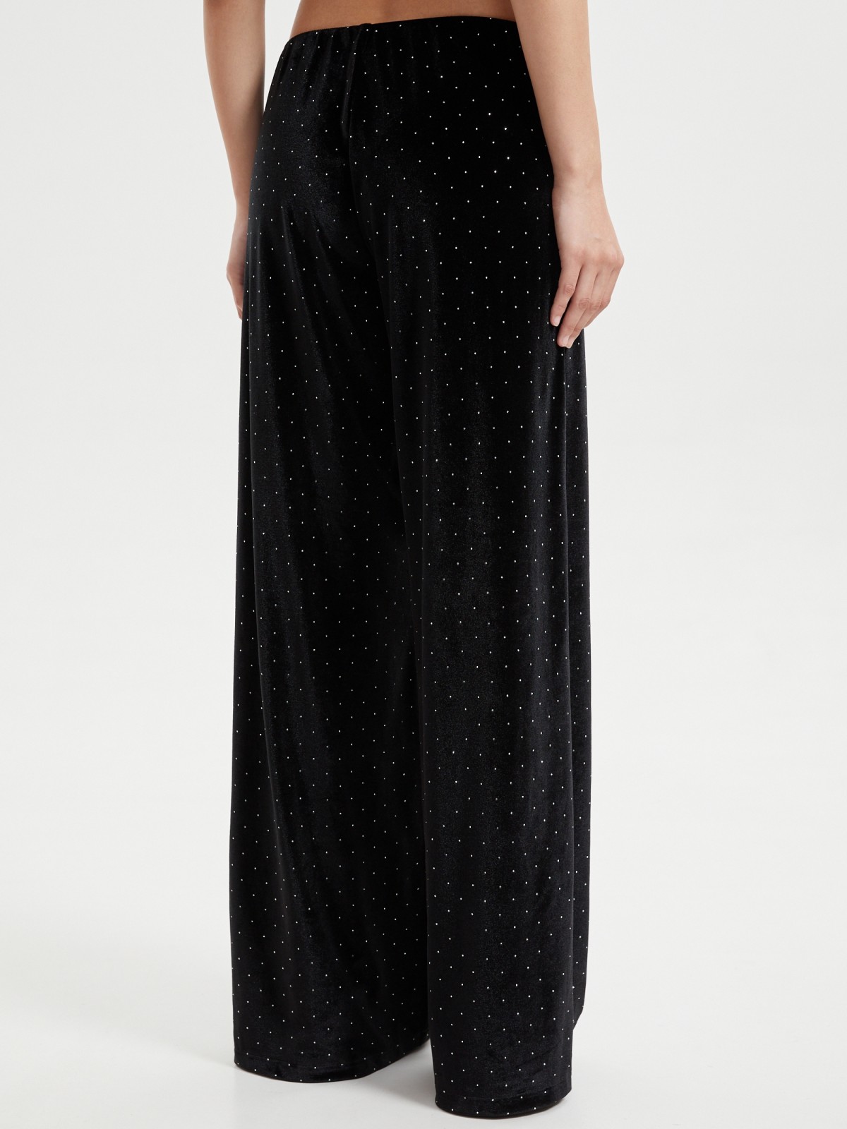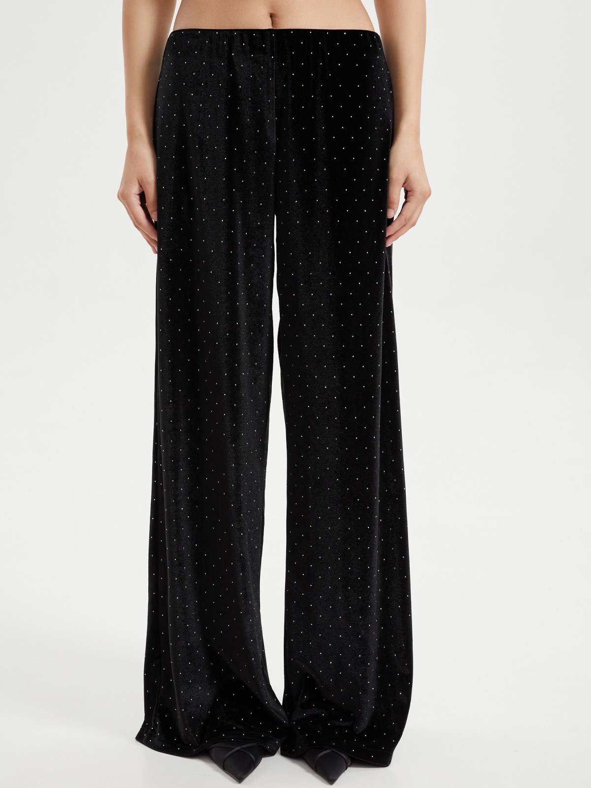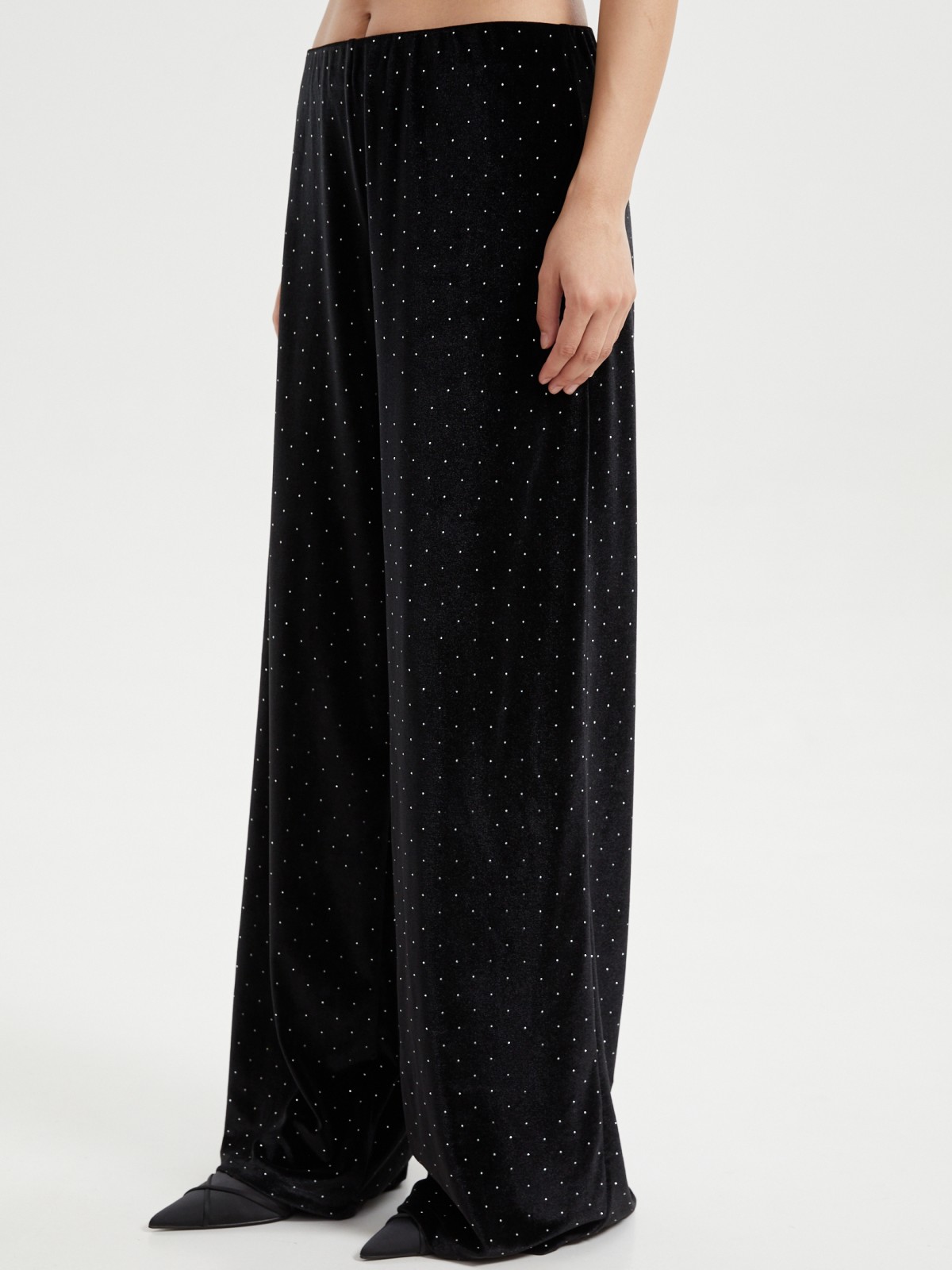 Чёрные бархатные женские брюки широкого комфортного фасона с мерцающими переливающимися стразами прекрасно подойдут для стильного праздничного образа на новогоднюю вечеринку или корпоратив. Рекомендуем собрать комплект с джемпером арт. N25451211011 в тон. Модель представлена в больших размерах.