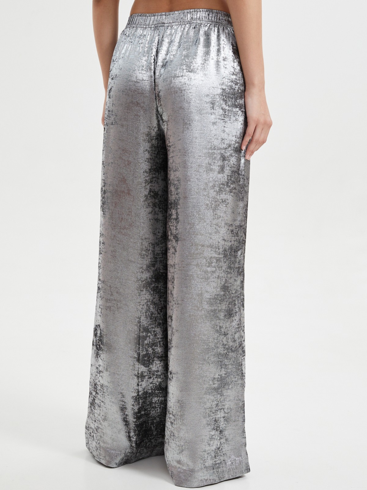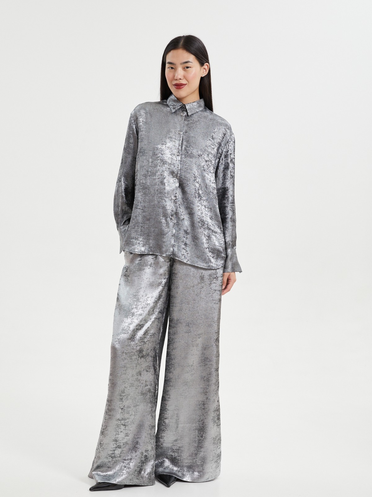 Женские брюки широкого комфортного фасона из тонкой нарядной ткани с серебряным блеском прекрасно подойдут для стильного праздничного образа на новогоднюю вечеринку или корпоратив. Рекомендуем собрать комплект с рубашкой арт. N2545117Y021 в тон. Модель представлена в больших размерах.