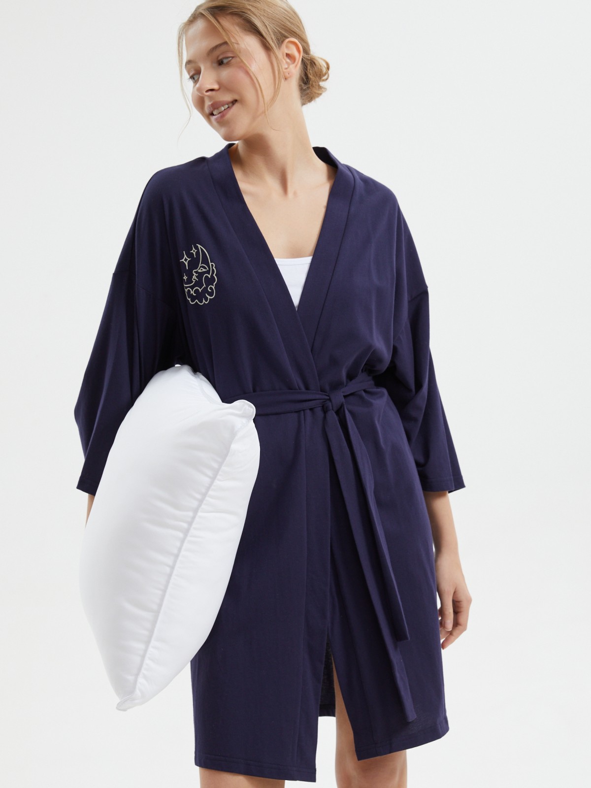 Короткий женский домашний халат из хлопкового трикотажа в синем цвете не раздражает кожу и поддерживает комфортную температуру. Уютная модель из хлопка дополнена милой вышивкой на груди, и представлена в больших размерах. Чтобы изделие не распахивалось, в комплекте предусмотрен съёмный пояс из основного материала в тон на талию.