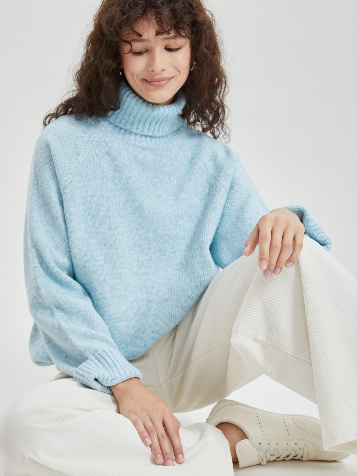 Вязаный женский свитер из пёстрой тёплой пряжи с добавлением шерсти идеально дополнит ваши комфортные утеплённые зимние образы на каждый день. Модель представлена в больших размерах.