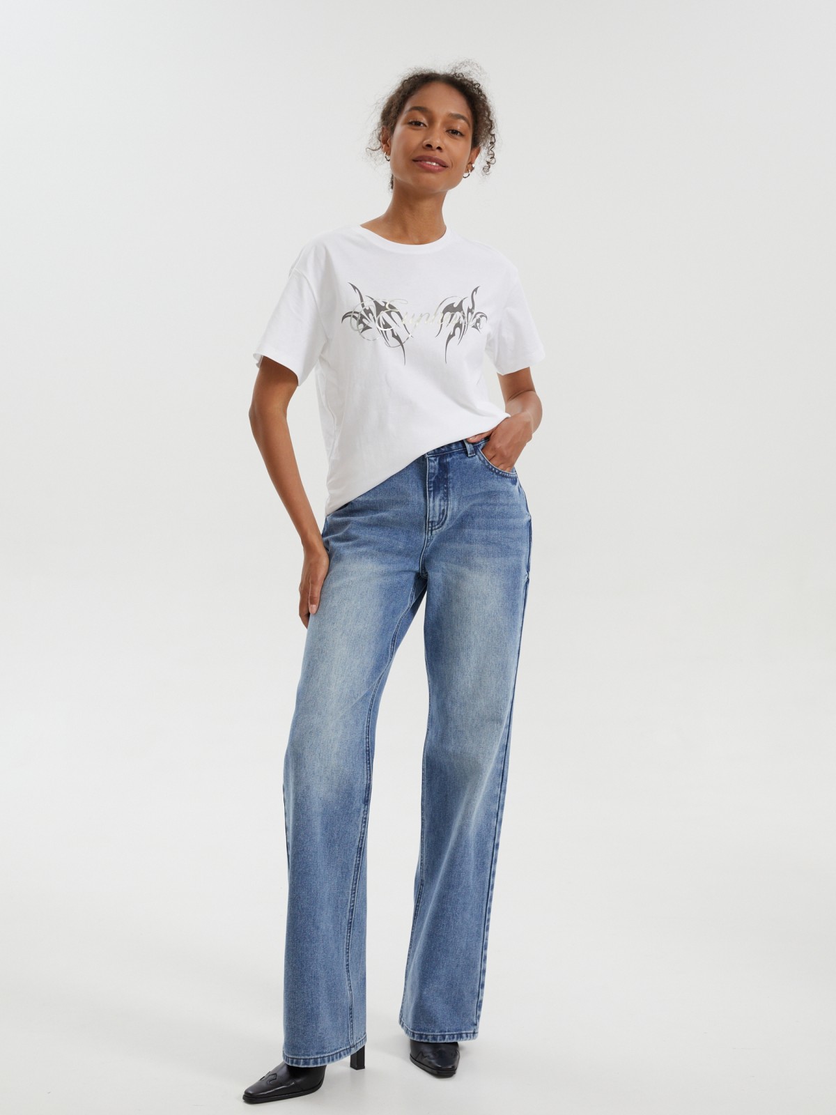 Прямые синие женские джинсы классического фасона, выполненные из смесового денима с высоким содержанием хлопка в составе, идеально впишутся в ваш комфортный повседневный гардероб. Модель остаётся универсальным модным выбором для стильного кэжуал-аутфита, и прекрасно сочетается с любым типом верха. Джинсы представлены в больших размерах.