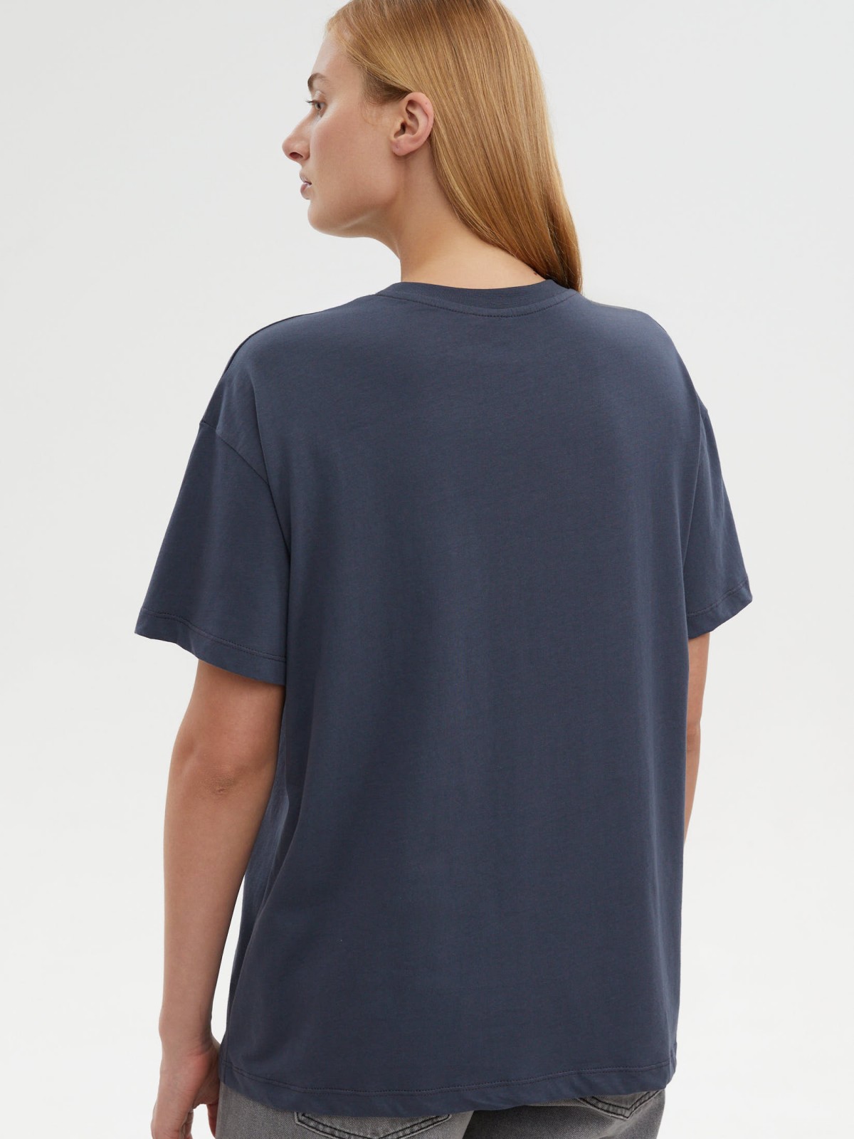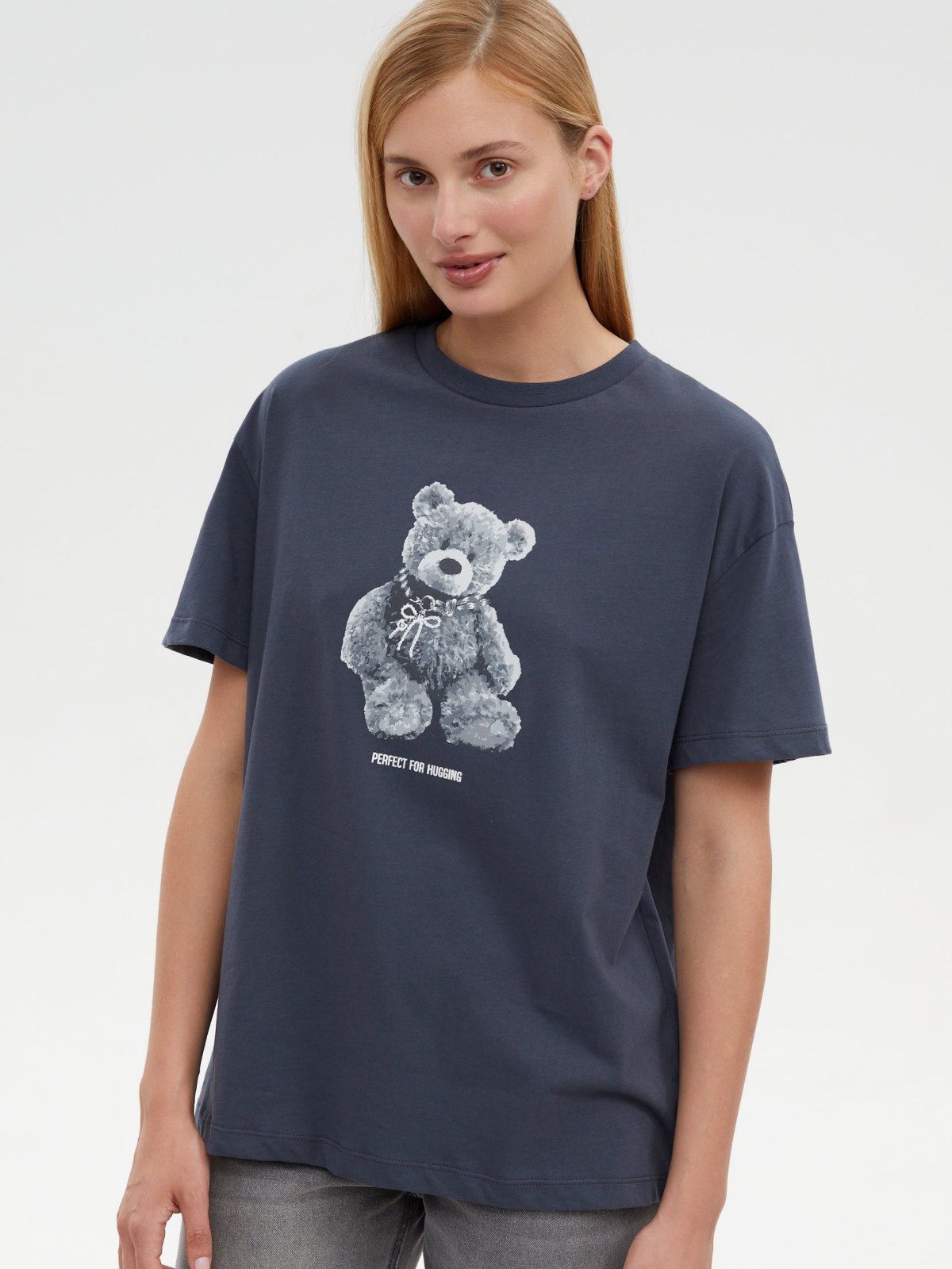Серая женская футболка из хлопка объёмного и широкого фасона с милым принтом с мишкой на груди удачно дополнит ваш практичный трендовый образ на каждый день. Модель представлена в больших размерах.