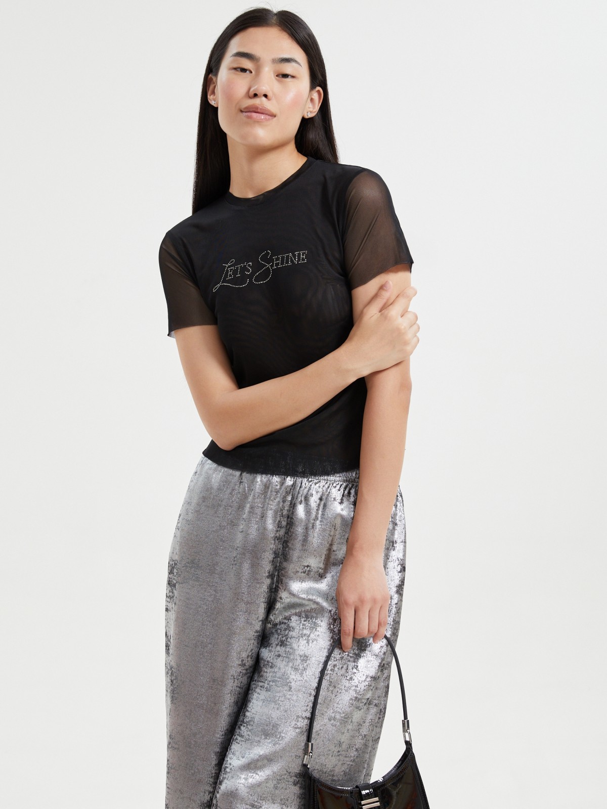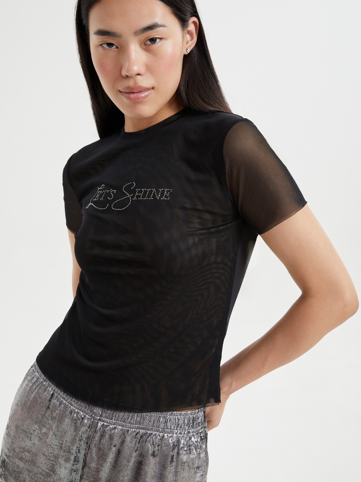 Чёрная женская футболка-топ из эластичной полупрозрачной сетки с непрозрачной подкладкой спереди и декоративной надписью из мерцающих страз на груди гармонично дополнит ваш яркий нарядный образ для праздничной вечеринки и веселой атмосферы новогодней ночи. Модель представлена в больших размерах.