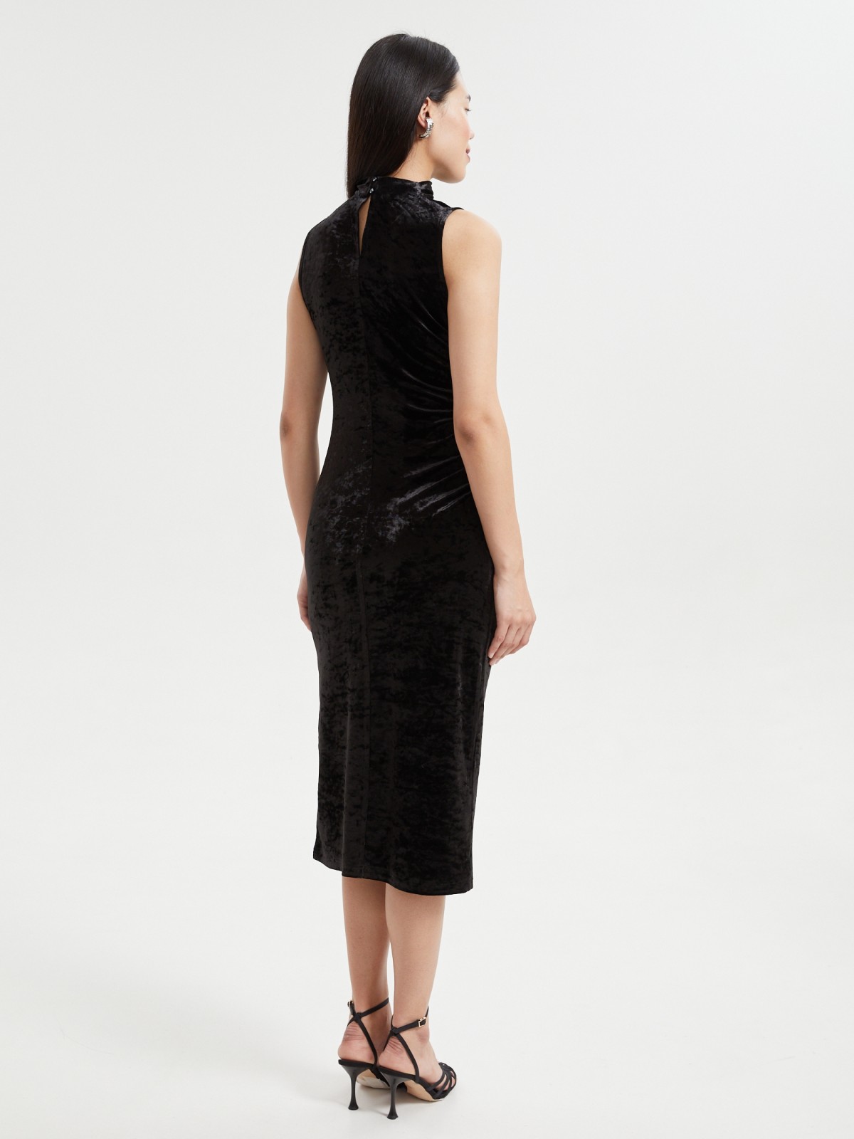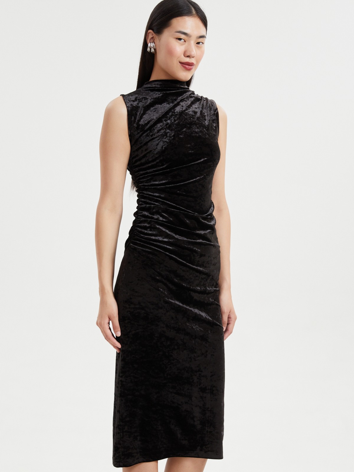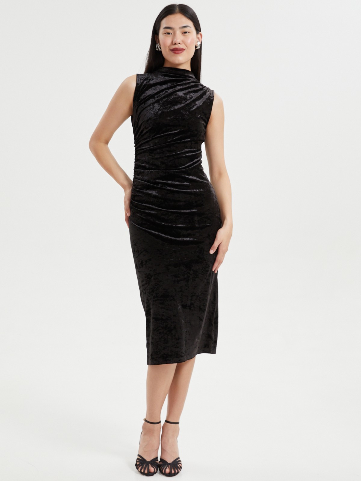 Красивое чёрное женское платье с акцентной драпировкой, выполненное из нарядной бархатной ткани, прекрасно подойдёт для стильного образа на праздничную новогоднюю вечеринку или корпоратив, обеспечив всему образу элегантную женственность. Модель представлена в больших размерах.