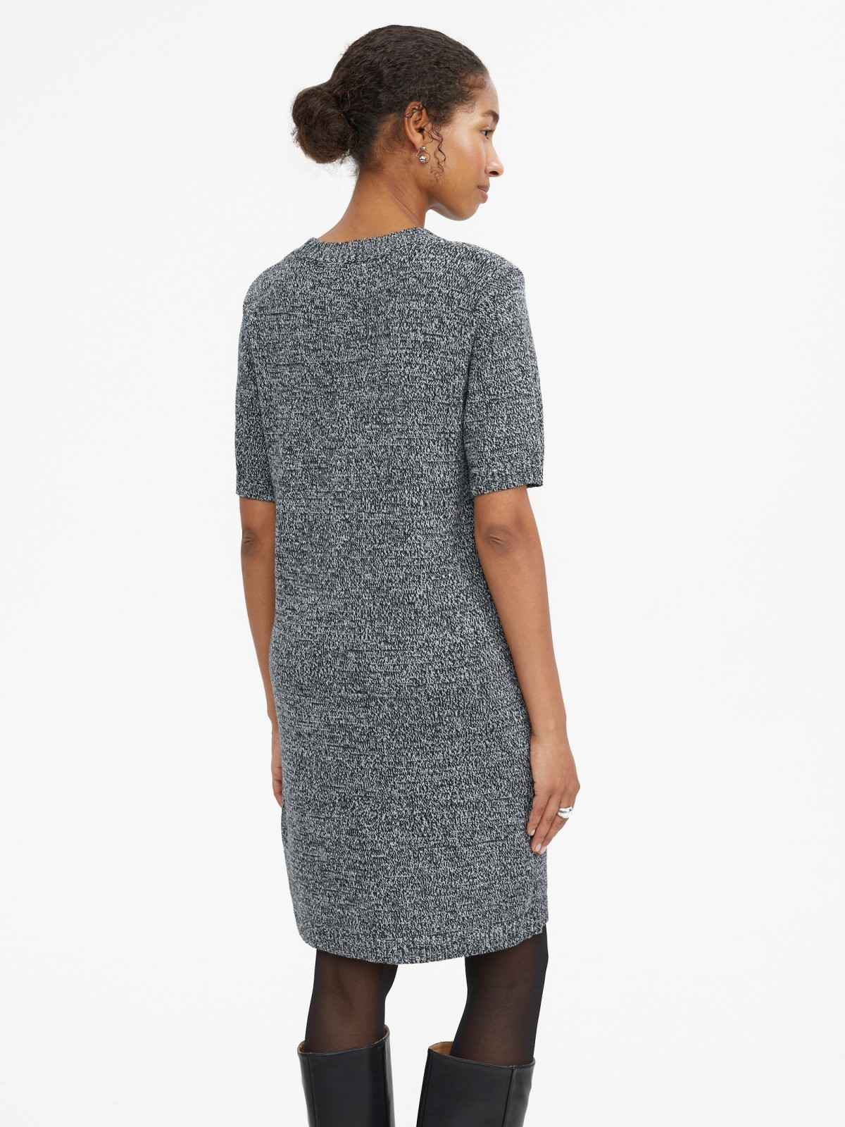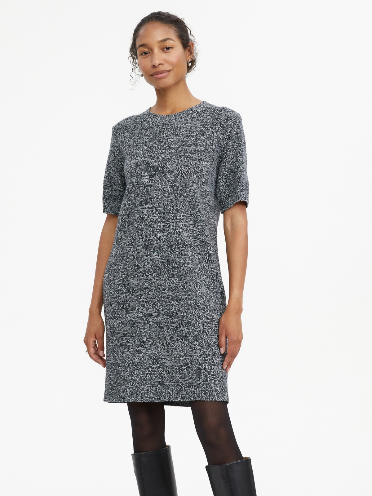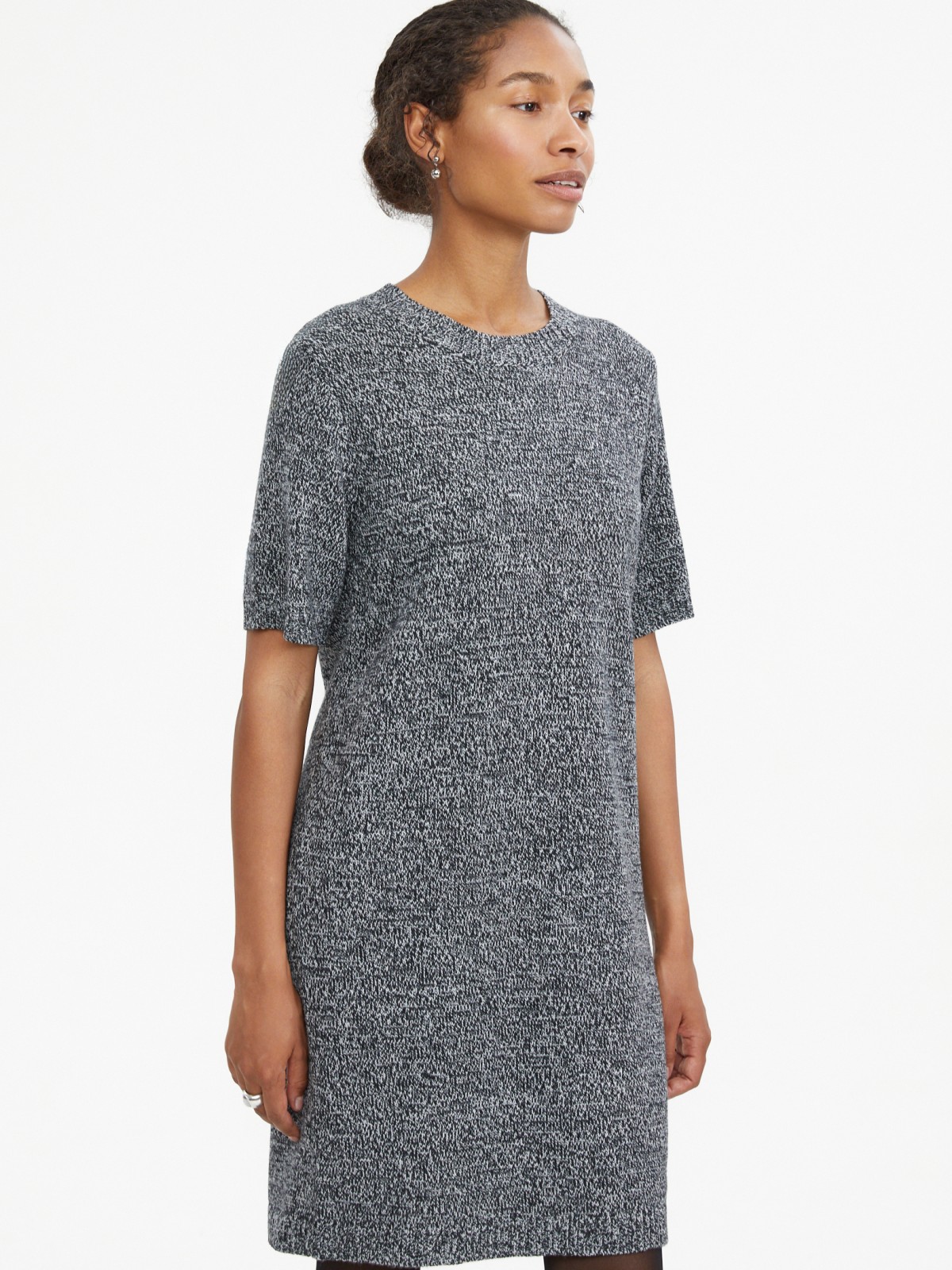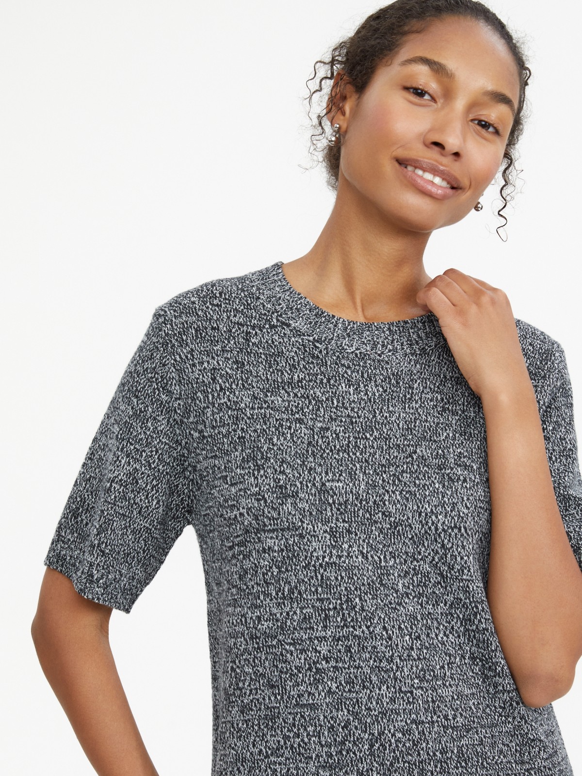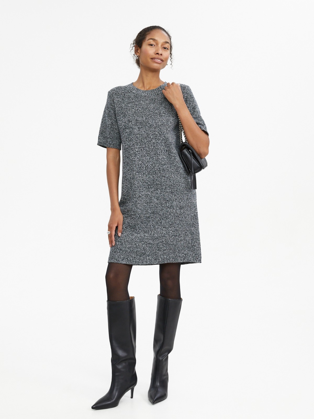 Короткое вязаное женское платье-футболка с меланжевом сером оттенке идеально впишется в стильный повседневный или вечерний гардероб современной модницы. Модель представлена в больших размерах.
