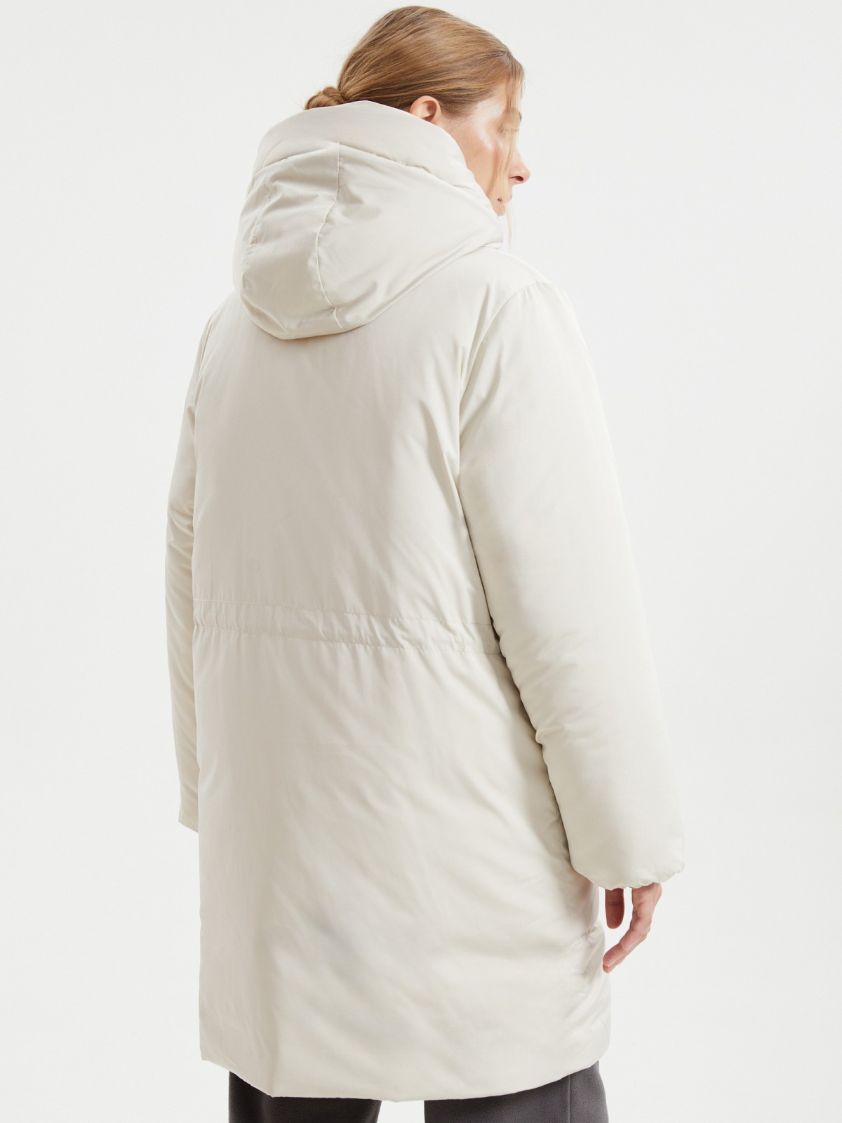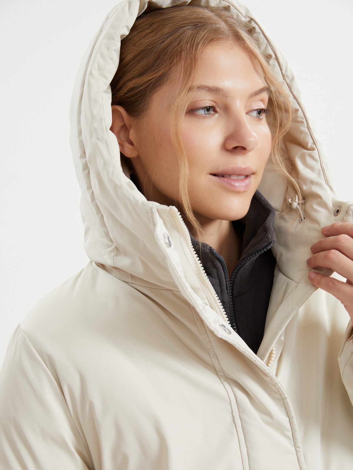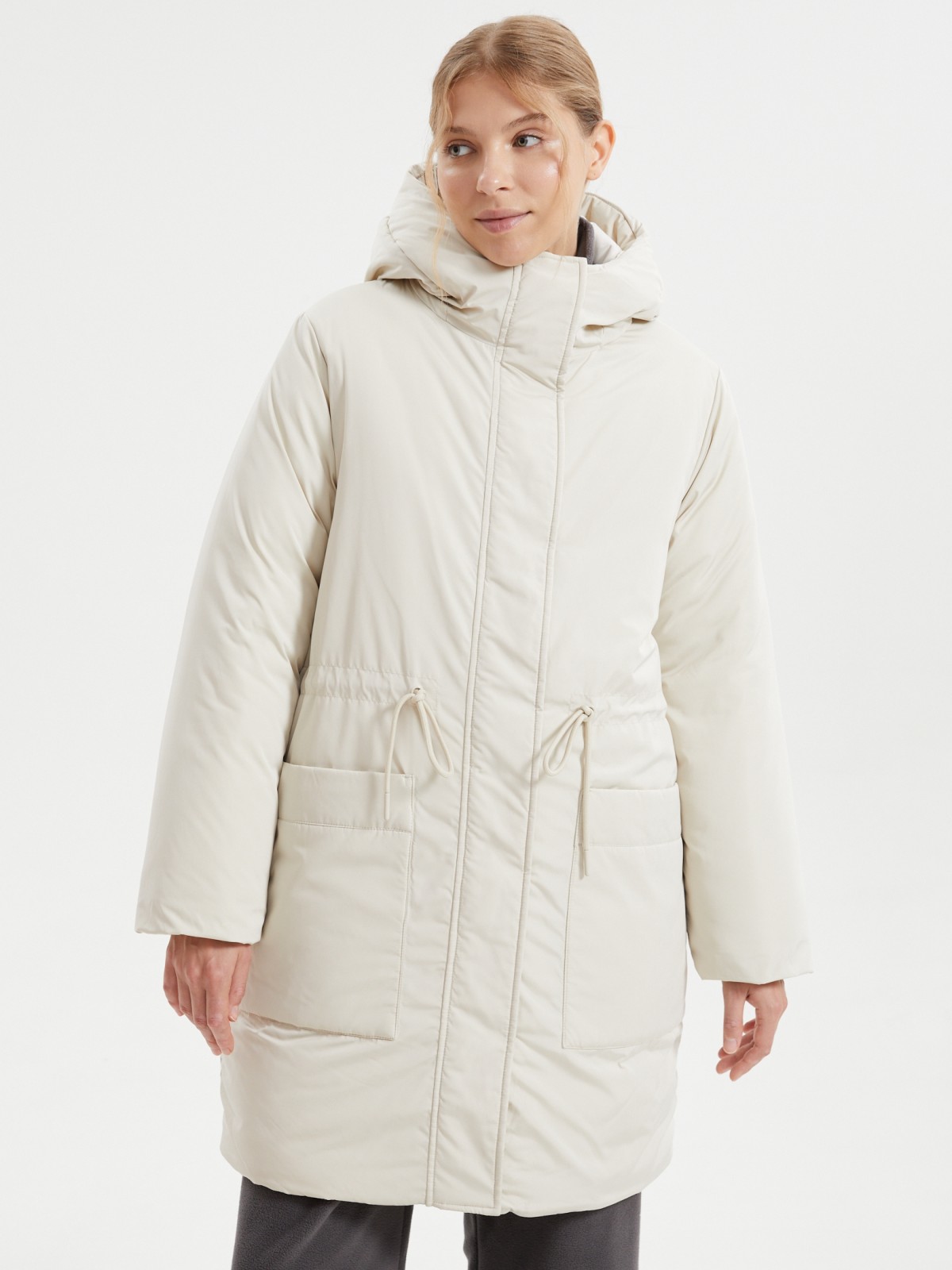 Длинная тёплая молочно-белая женская куртка-парка с надёжным слоем утеплителя-синепуха будет максимально комфортной в носке в холодную погоду зимнего сезона. Модель представлена в больших размерах.