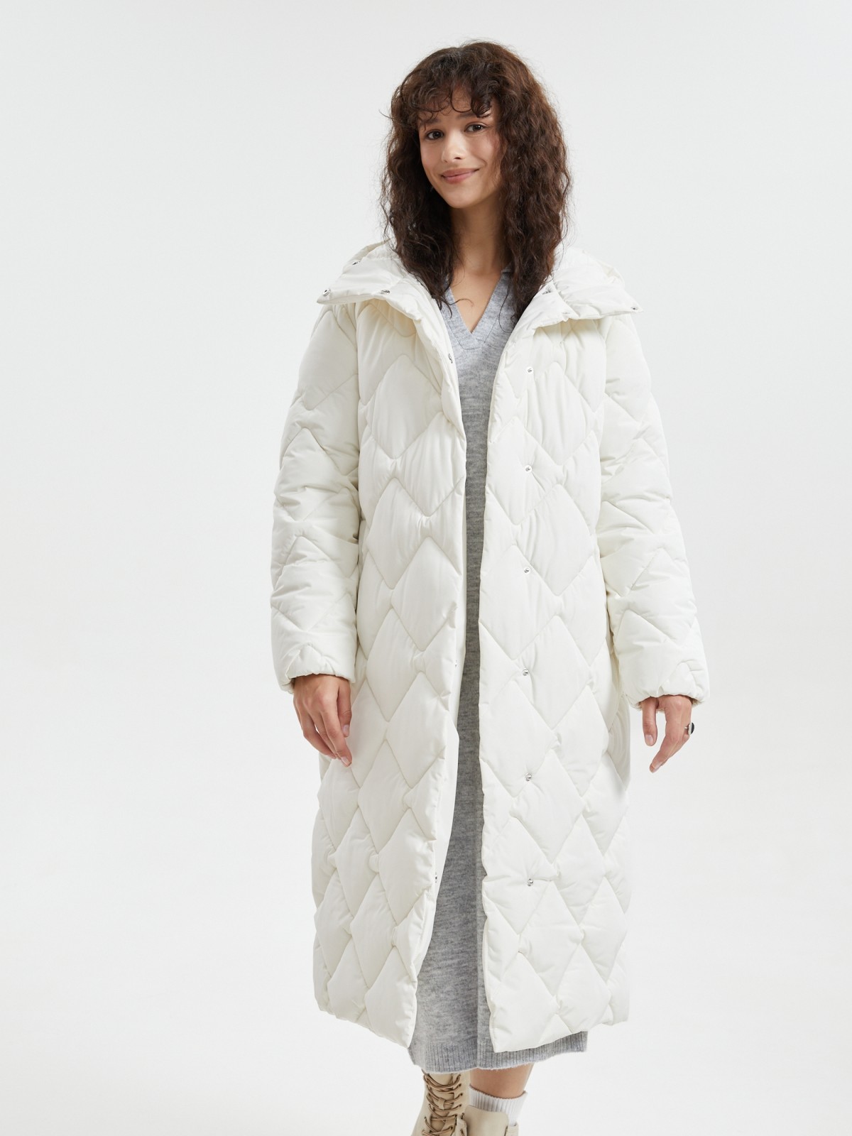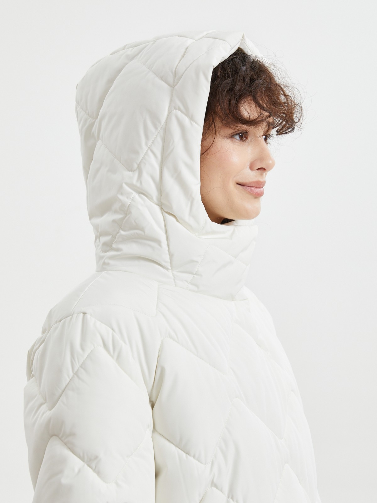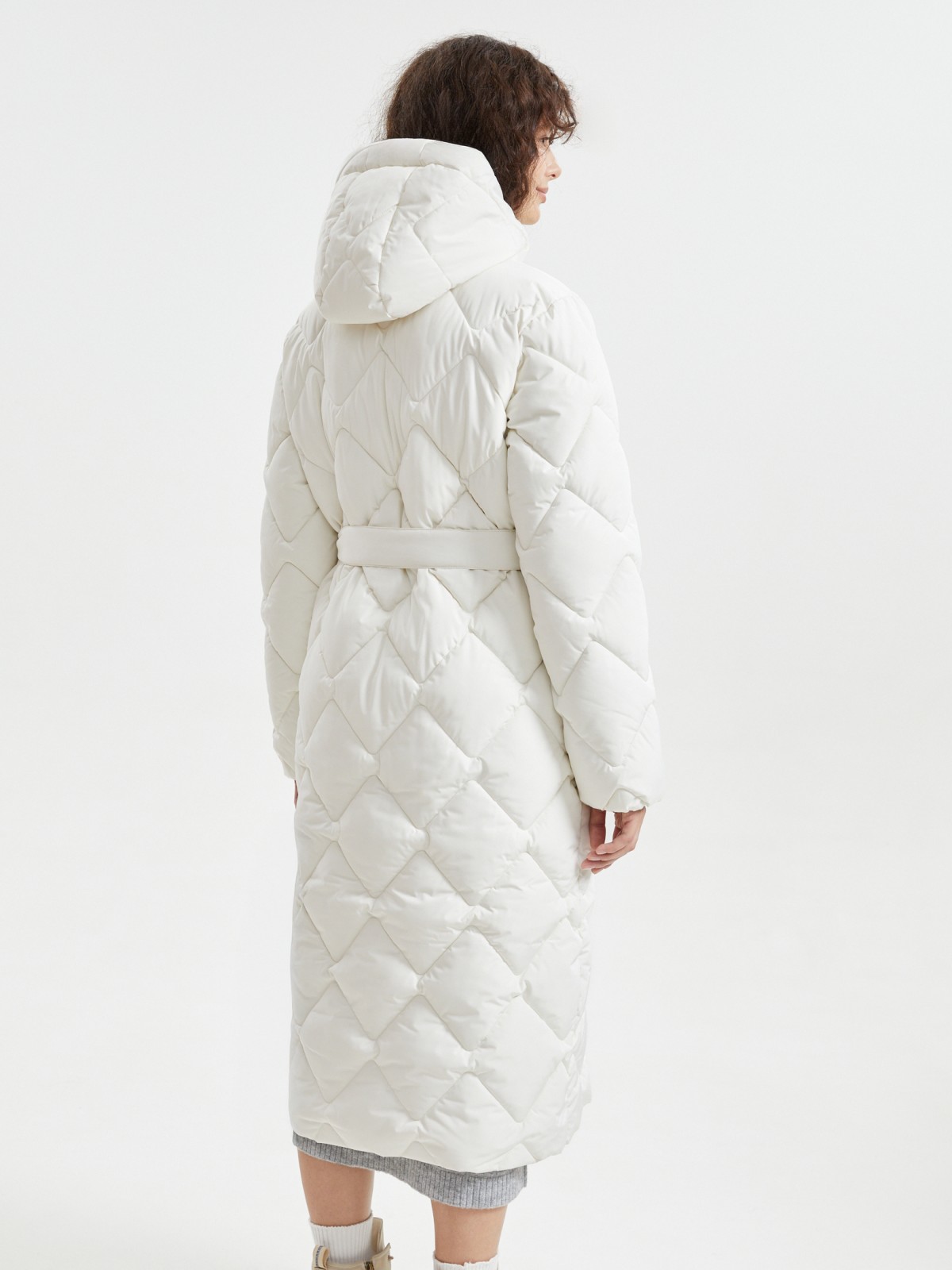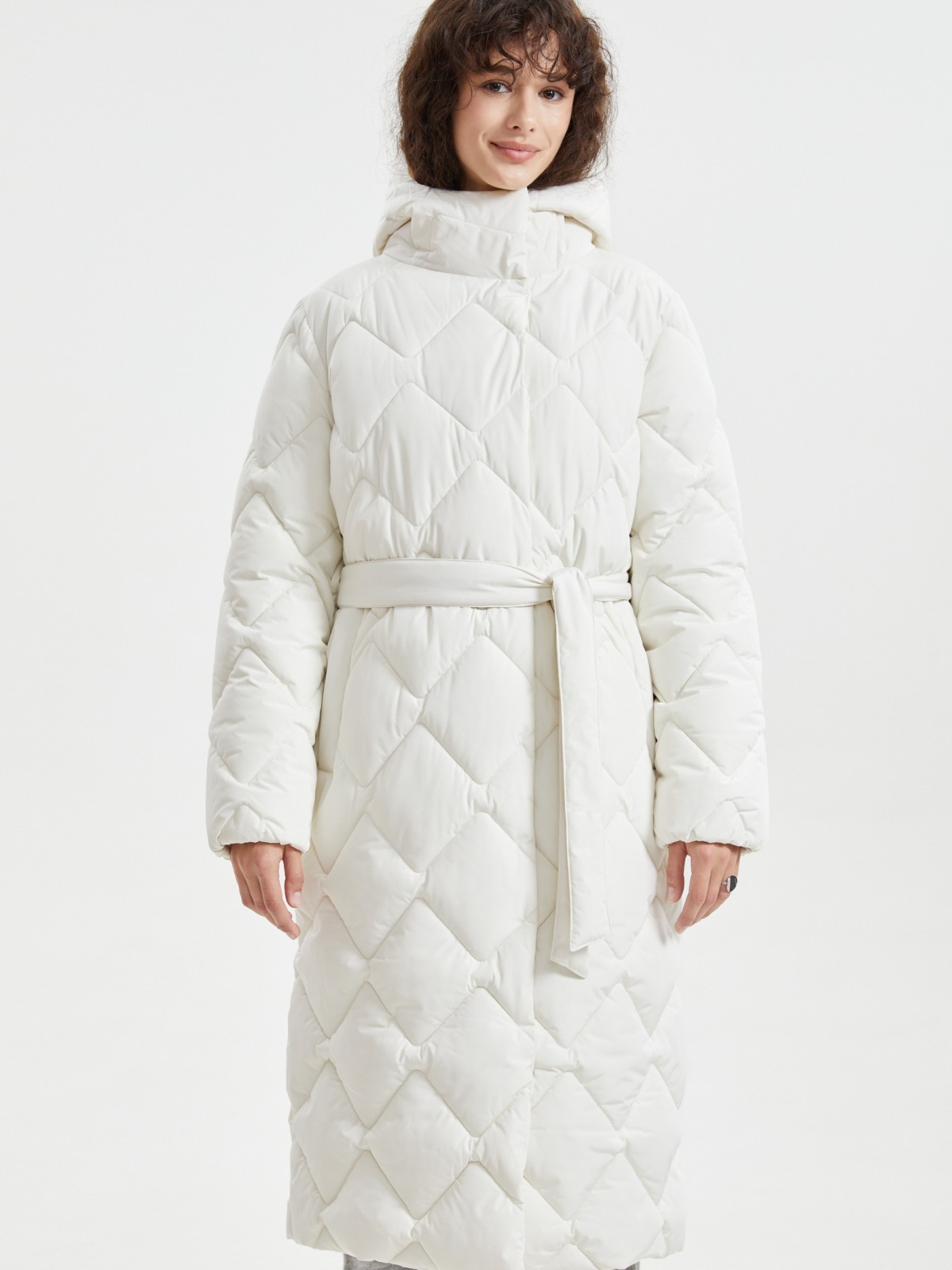 Тёплая стёганая куртка-пальто с капюшоном и поясом