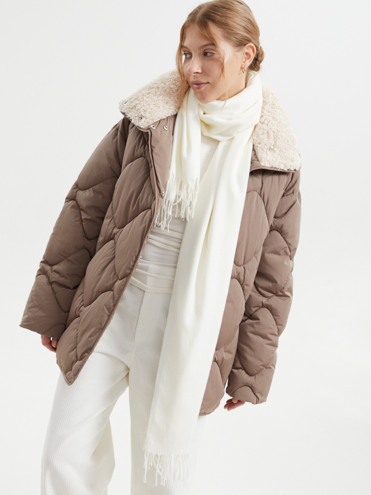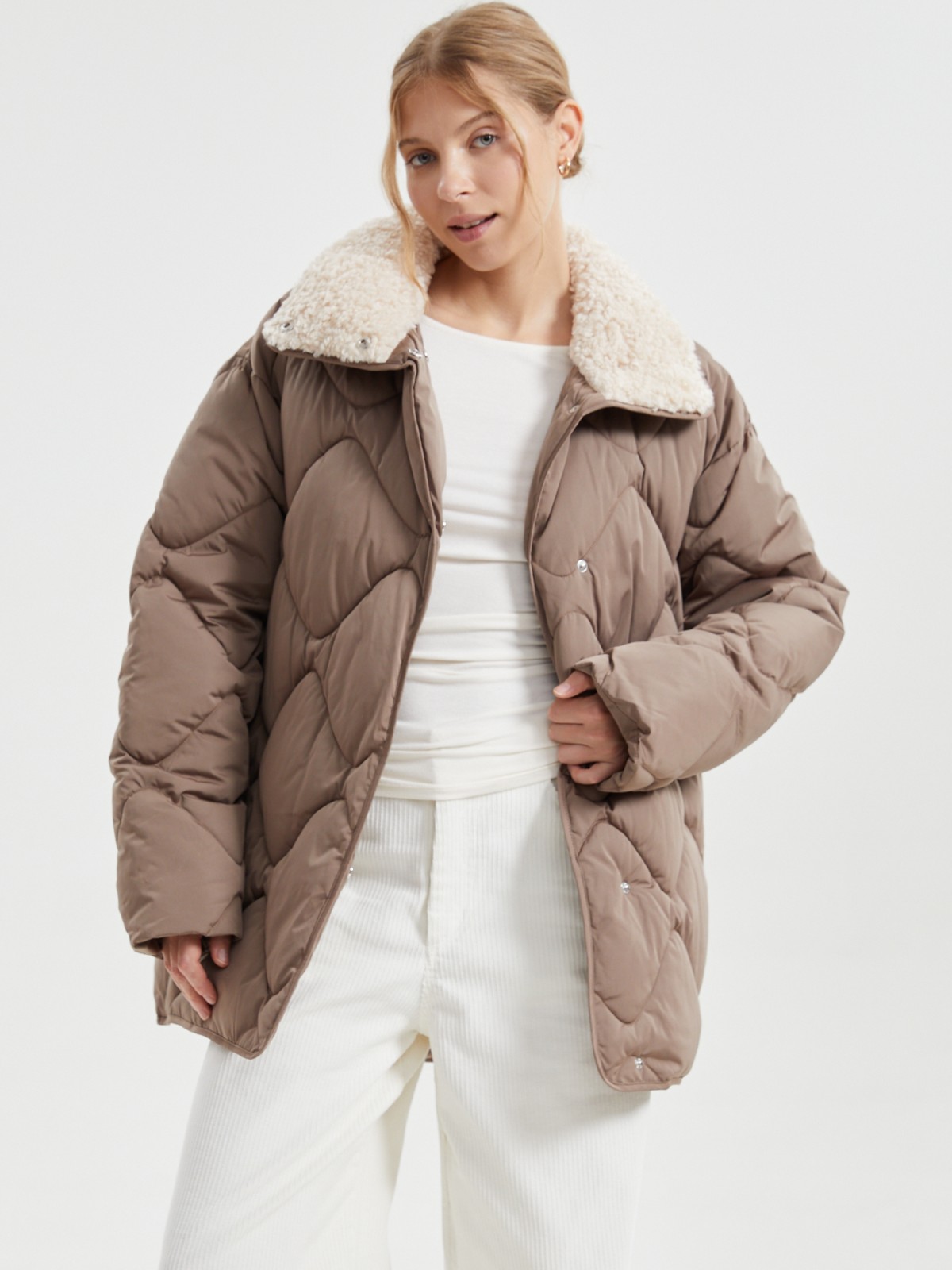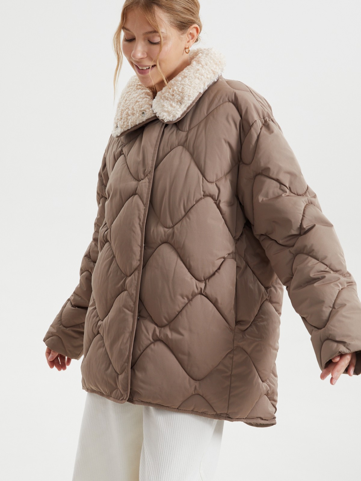 Тёплая стёганая женская куртка комфортного фасона с меховым воротником, дополненная слоем утеплителя-синтепуха, прекрасно подойдёт для холодной погоды зимнего сезона. Модель представлена в больших размерах.