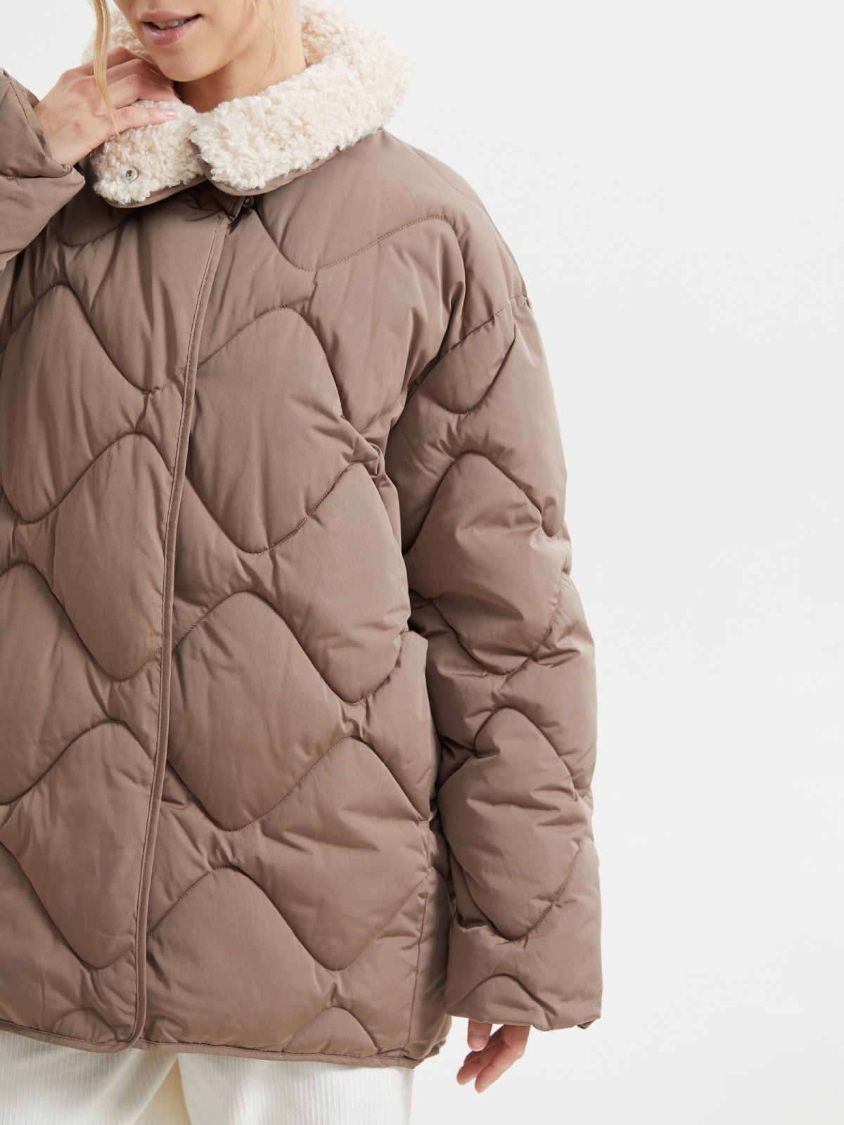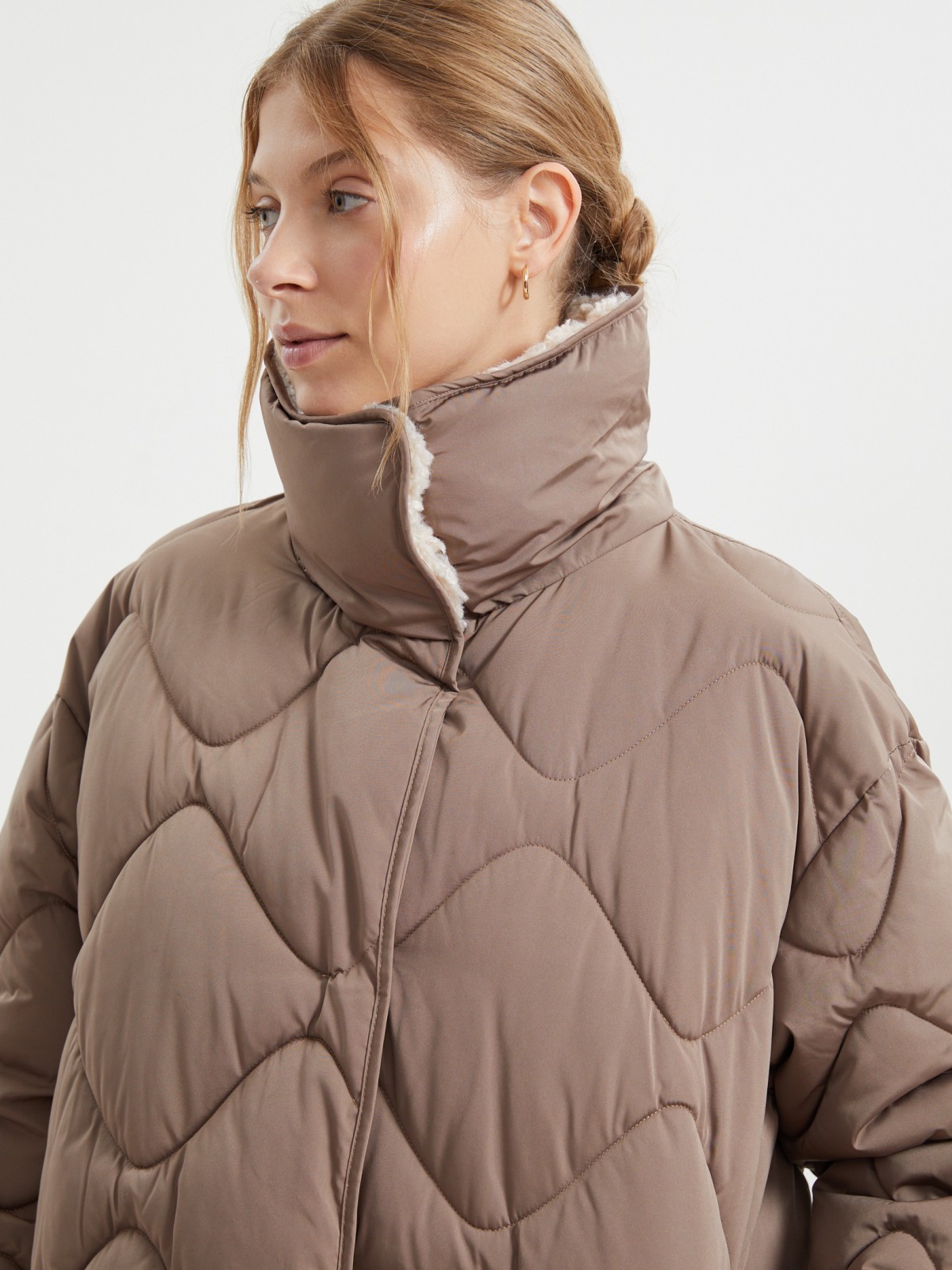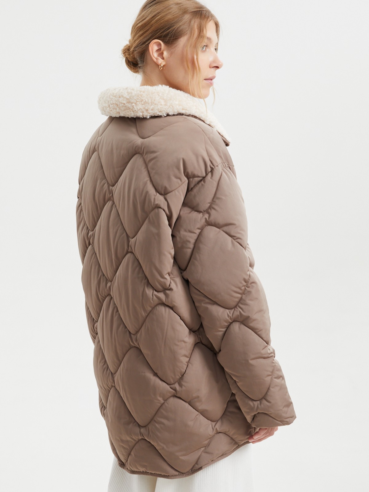 Тёплая стёганая женская куртка комфортного фасона с меховым воротником, дополненная слоем утеплителя-синтепуха, прекрасно подойдёт для холодной погоды зимнего сезона. Модель представлена в больших размерах.
